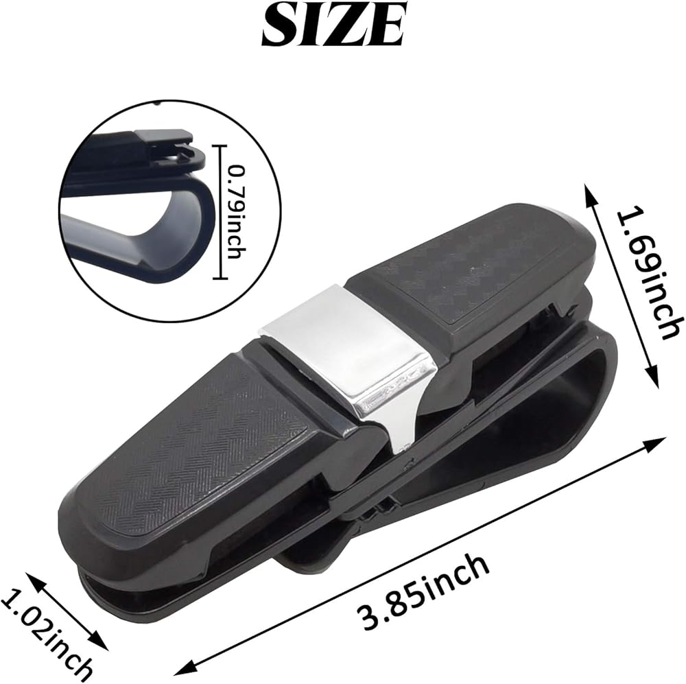 Measurement: 3.85x 1.02x 1.69inch (L x W x H), the eyeglasses hanger clip is suitable for sun visor whose thickness is thinner than 0.98 inche, helps store glasses and make your car's interior environment tidy.