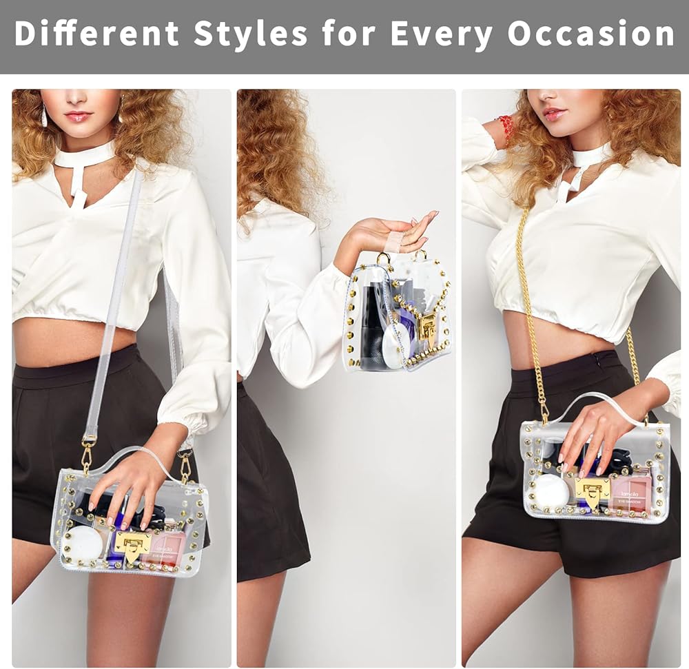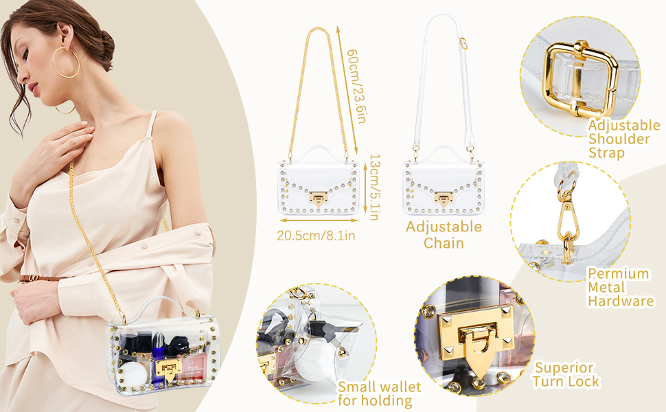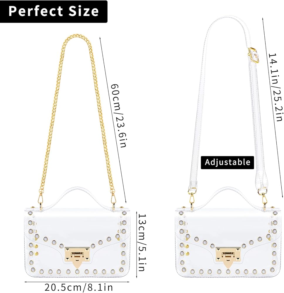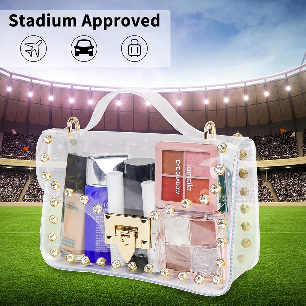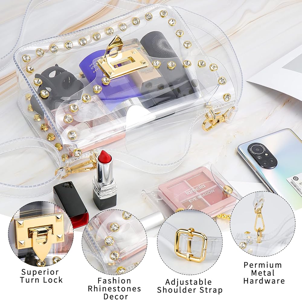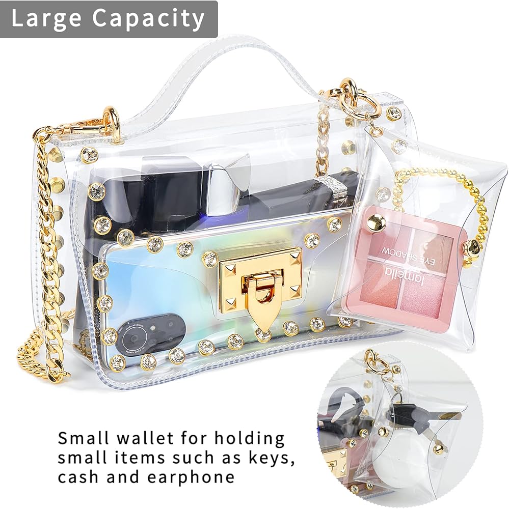 استخدام واسع: يمكن أن تساعدك محفظة Hysagtek الشفافة على اجتياز فحص الأمان بسهولة وسرعة، ويمكنك رؤية كل شيء في المحفظة في لمحة. يمكن استخدام المحافظ الشفافة للنساء في العديد من المناسبات مثل الملاعب، والحفلات الموسيقية، والمهرجانات، والمطارات، والمناسبات الرياضية، وأي أنشطة خارجية، مجهزة بديكور من أحجار الراين المتلألئة، تجعلك الأكثر جاذبية بين الناس.