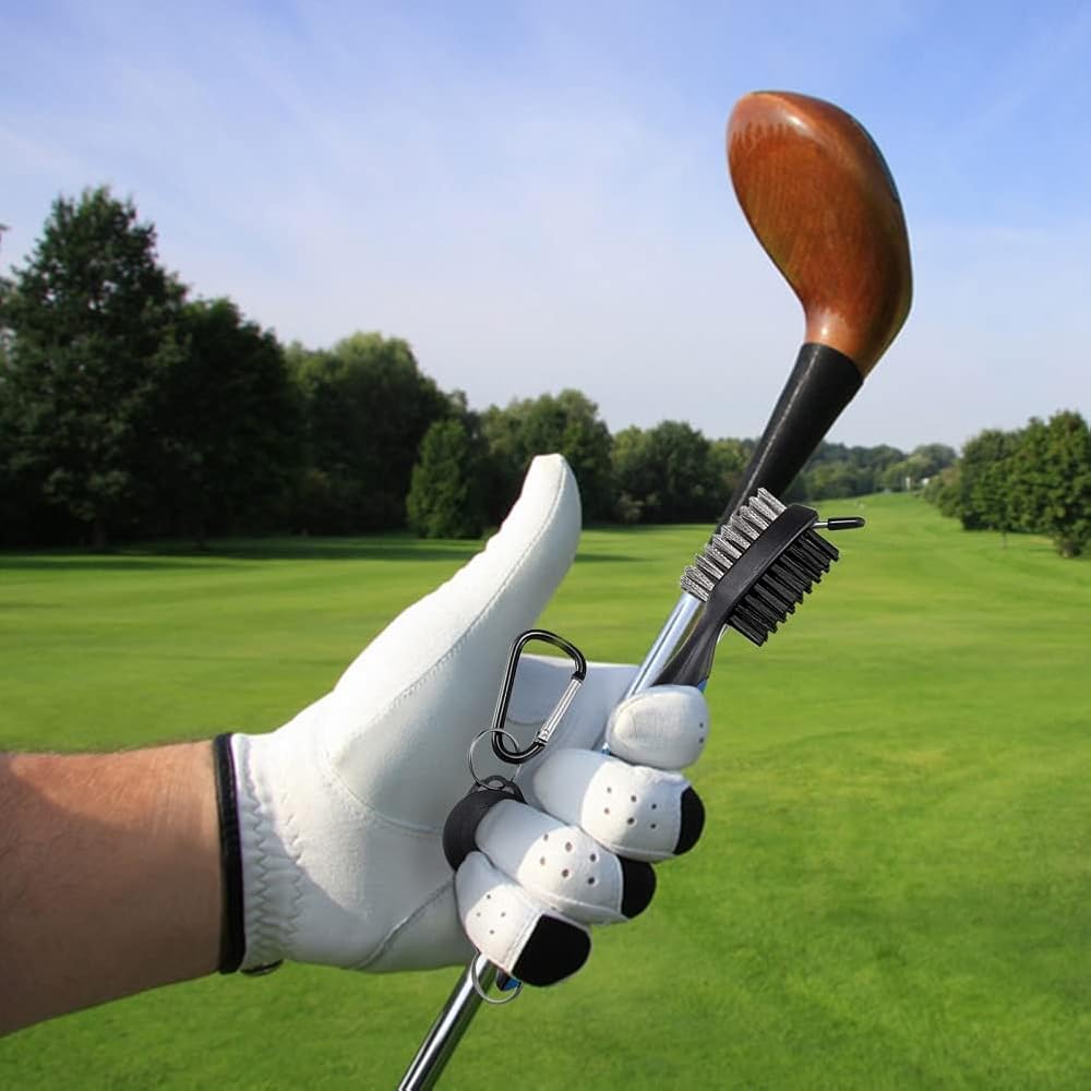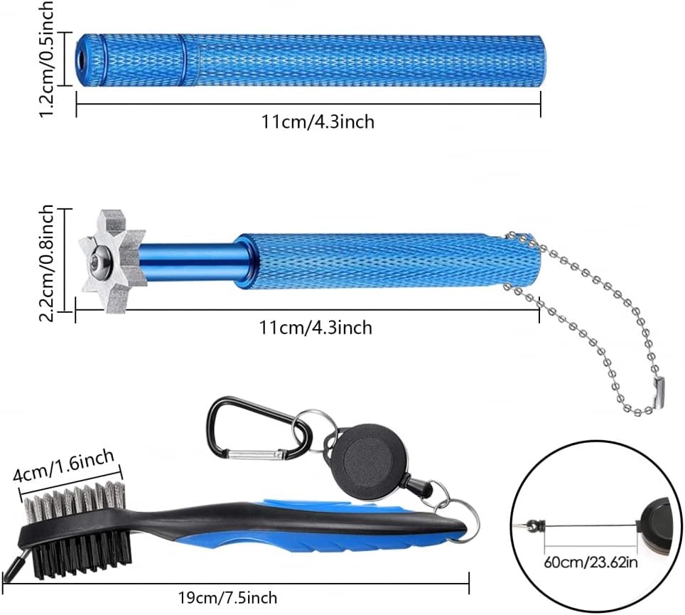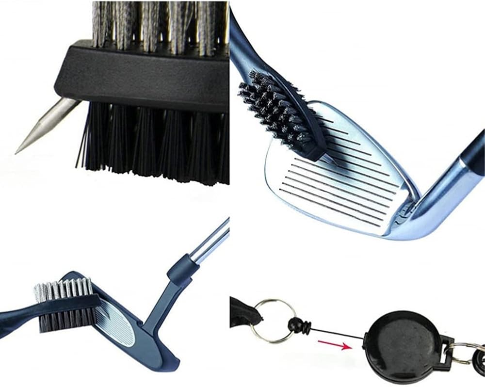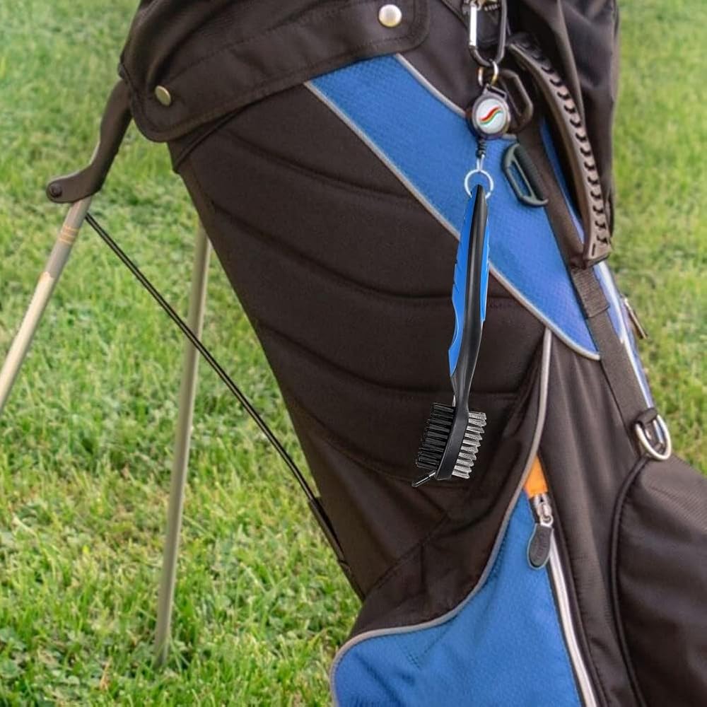 - It has a double-headed club brush that can be hung on the bag with a clip, and a club groove sharpener that can be stored in a transparent container for easy storage. Perfect practical accessory for golfers.