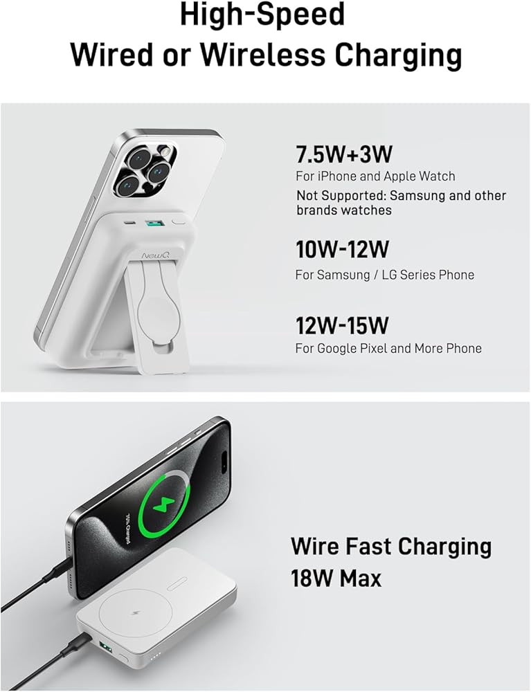 【أمان فائق】: يتميز الشاحن المحمول اللاسلكي بالشحن الزائد والتفريغ الزائد والتيار الزائد وحماية الدائرة القصيرة لحماية سلامة جهازك. يمكن لشريحة التحكم الذكية المدمجة والحل المزدوج الخلية التعرف تلقائيًا على جهاز الشحن وضبط تيار الإخراج والتحكم بدقة في درجة الحرارة في الوقت المناسب لحماية سلامة بطارية هاتفك.
