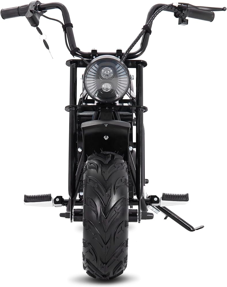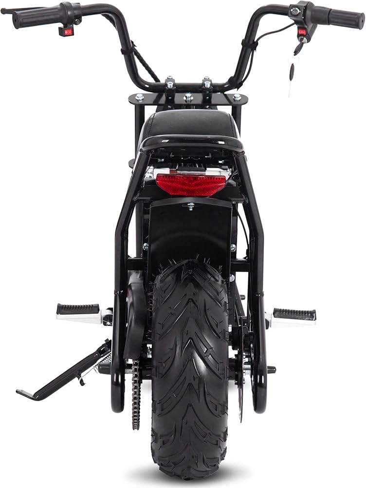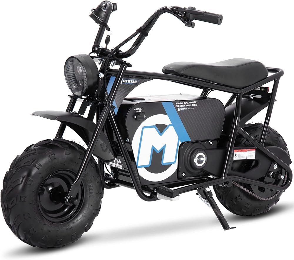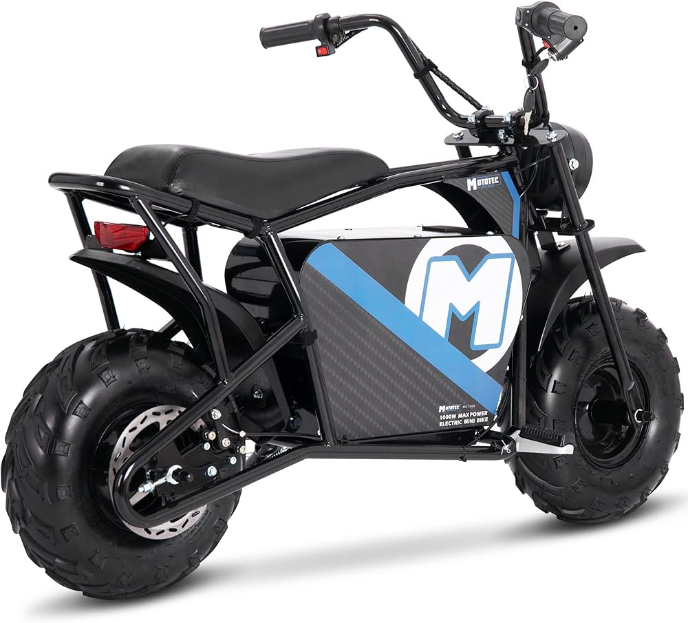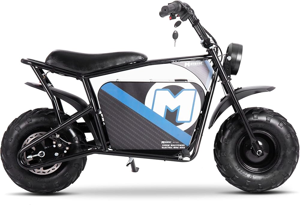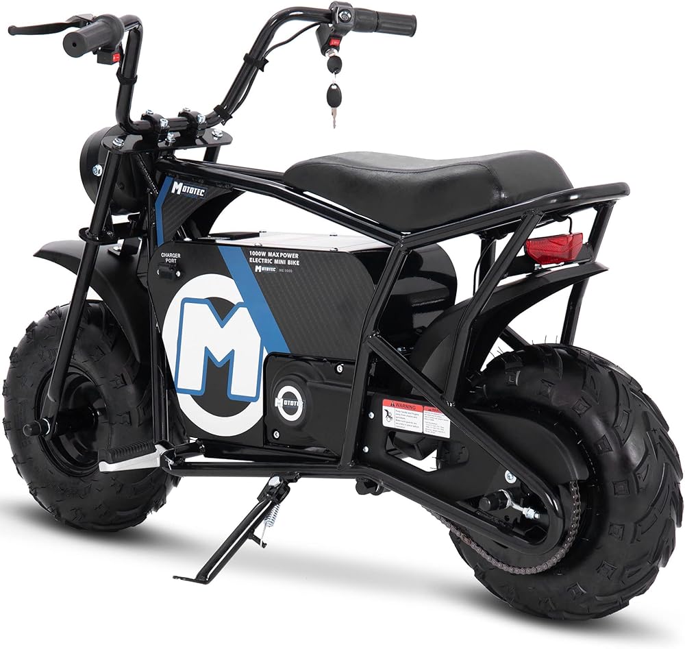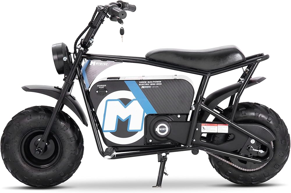 Introducing the MotoTec 48v 1000w Electirc Mini Bike! Just like the ones your parents used to drive, only safer and easier to use. Powered by a brushless 1000 watt electric motor, rugged chain drive and half twist throttle for easy operation. Large front headlight, key start and half twist throttle for safetly. With it's rugged steel frame and huge knobby tires, this mini bike is built tough to handle the roughest of terrain. Motor: 48v 1000w (Permanent Magnet Brushless) Battery: 48v/12ah Sealed Lead Acid (Four 12v/12ah) Top Speed: 20mph Throttle: Twist Key: Yes Frame: Steel Transmission: Chain Drive Front & Rear Wheels: 145/70-6 Brakes: Rear Disc Suspension: Ridged Front Headlight: LED Rear Brake Light: LED Max Rider Weight: 150lbs Seat Height: 26 inches Wheelbase: 42 inches Min Ground Clearance: 6 inches Box Weight: 117 lbs Box Size: 39x15x25 inches Mini Bike Weight: 99lbs Mini Bike Size: 57x27x37 inches Warranty: 30 days parts replacement