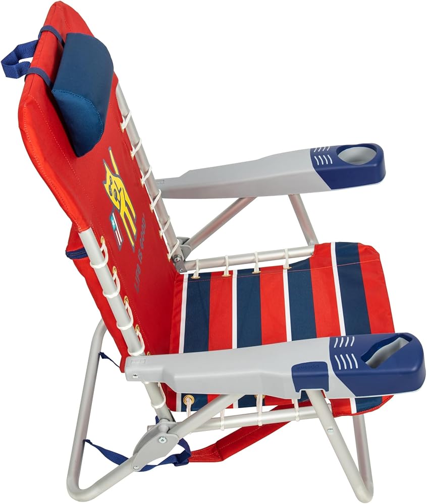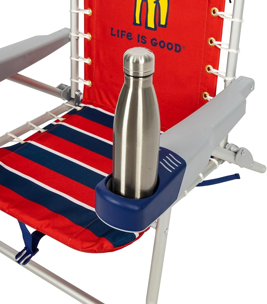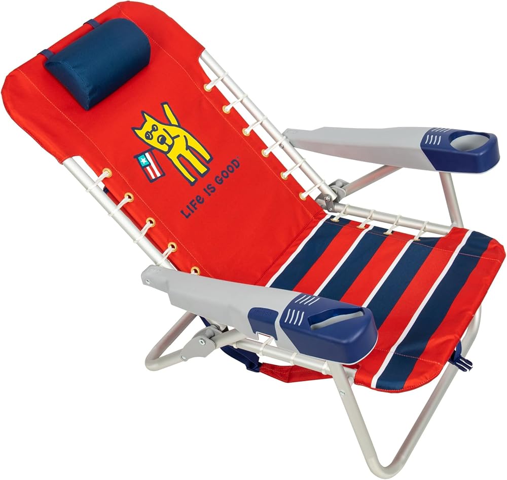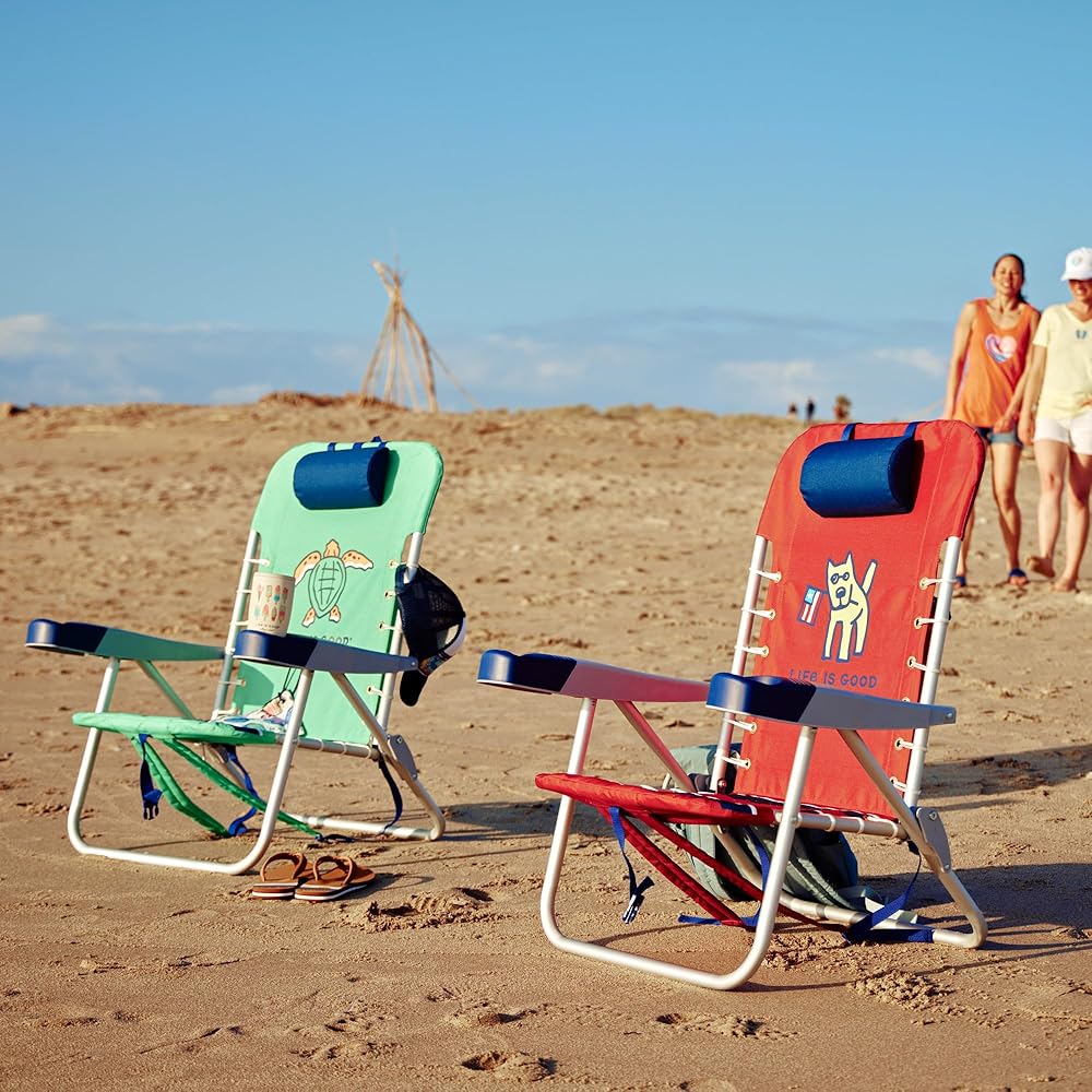 Elevate your outdoor leisure with the Life is Good Portable Beach Chair, a perfect fusion of comfort and convenience. Whether lounging by the ocean, soaking up the sun poolside, or enjoying some downtime in your backyard oasis, this versatile folding lounge chair enhances every moment. Featuring four adjustable positions, the Life is Good folding backpack beach chair offers you a comfortable place to rest after your outdoor excursions. Designed for on-the-go ease, this travel beach chair boasts a spacious back pouch for essentials and doubles as an insulated zippered cooler bag for drinks and cold items. Stay refreshed with the built-in seatside cup holder and keep your phone nearby in the integrated phone holder located on the armrest. The chair also features a bottle opener for convenience. Unwind with the adjustable and removable pillow, offering ultimate relaxation under the sun. Crafted for portability and durability, this portable beach chair is lightweight with padded backpack straps for easy transport. Constructed from rust-proof aluminum, it promises lasting performance, ideal for all your outdoor adventures. Measuring 24.21" D x 28" W x 33" H when open, it provides ample space for relaxation wherever your journeys take you.