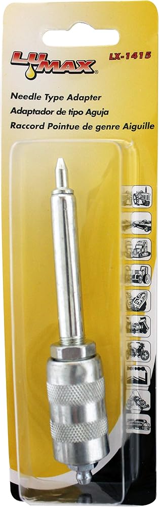 Lumax LX-1415 Silver 3-5/8" Needle-Type Adapter Needle-type Adapter, 5" (127 mm). Needle-Type Adapter for Flush or Hard-to-Reach Grease Fittings. For use on Hand-Operated Grease Guns Only. Needle-Type Adapter for Flush or Hard-to-Reach Grease Fittings. For use in Confined Places, especially, the Universal Joint Fittings. Includes Slide-On Locking Sleeve. A simple Push-On Motion quickly Attaches to a Standard Grease Coupler for Quick Service. Lumax is a manufacturer of lubrication and fluid management products. Our products, including grease guns, manual and electric pumps, funnels, drains, grease fittings, filter wrenches, and accessories, are built to the highest standards and incorporate many proprietary features. Lumax's mission is to provide professionals and consumers with innovative and high-quality products to get the job done right. Product development at Lumax goes beyond the physical product, to a deeper understanding of the end-users' needs. Engineered with the "user-in-mind, " Lumax products are built to the highest standards and incorporate many unique features that make work easier, faster and cost-effective. We have a passion for the design process. We listen to our customers and their ever-expanding requirements. Our unique products lead the field in design, quality, and performance.