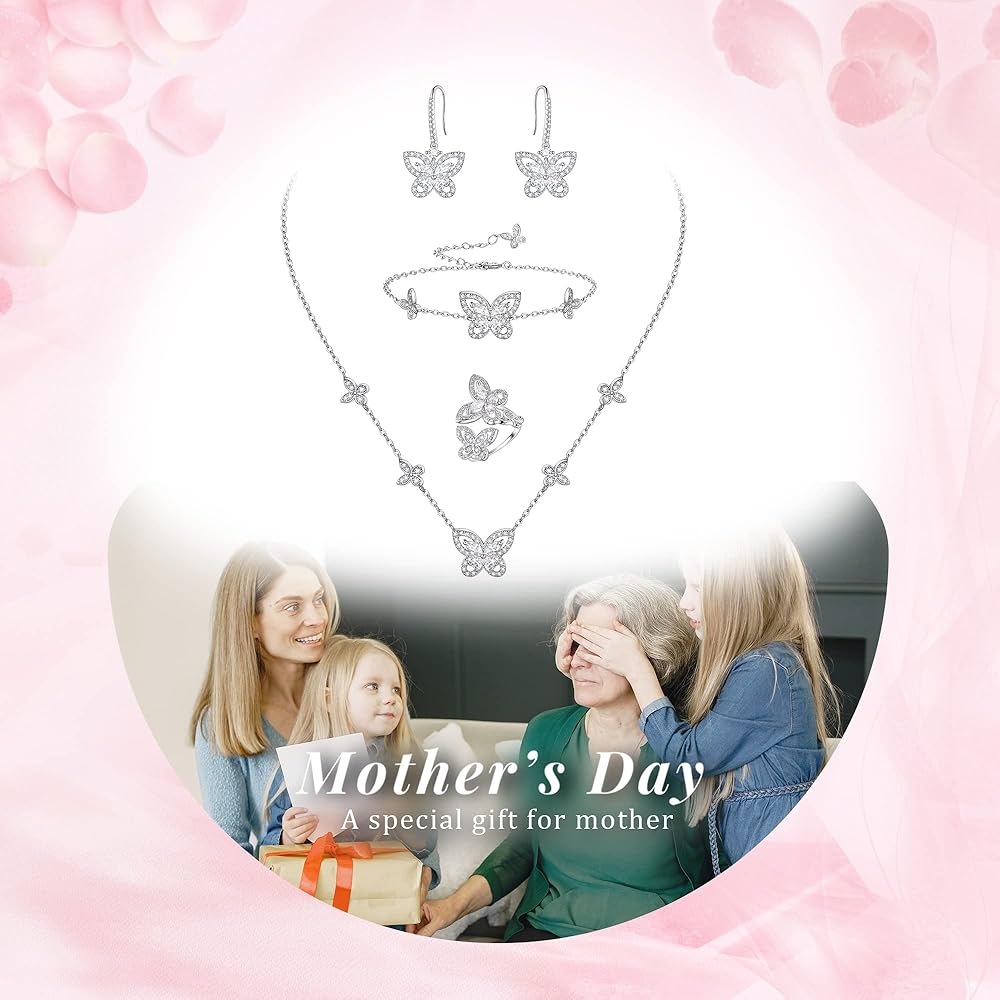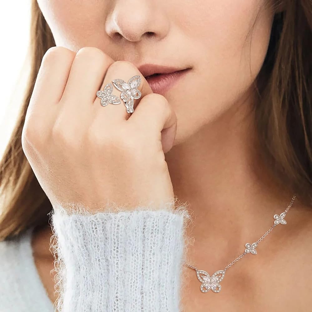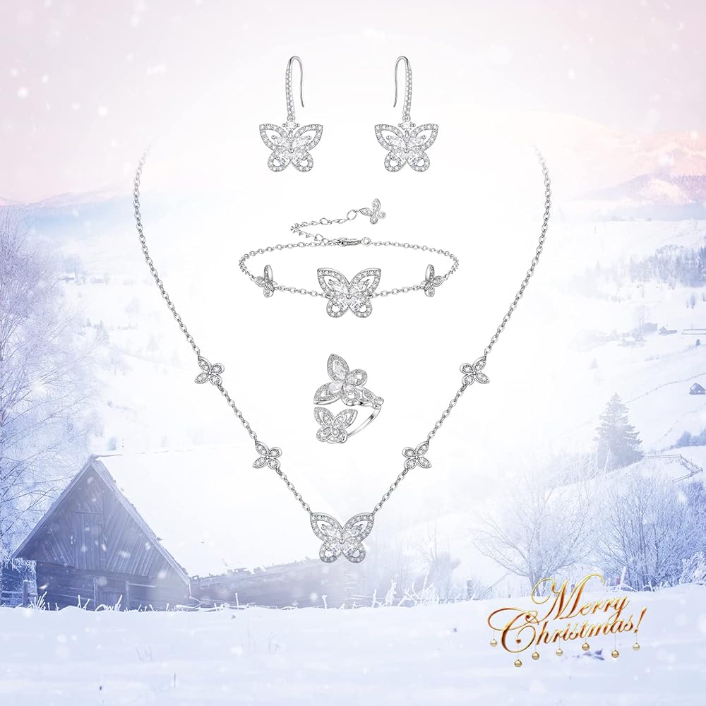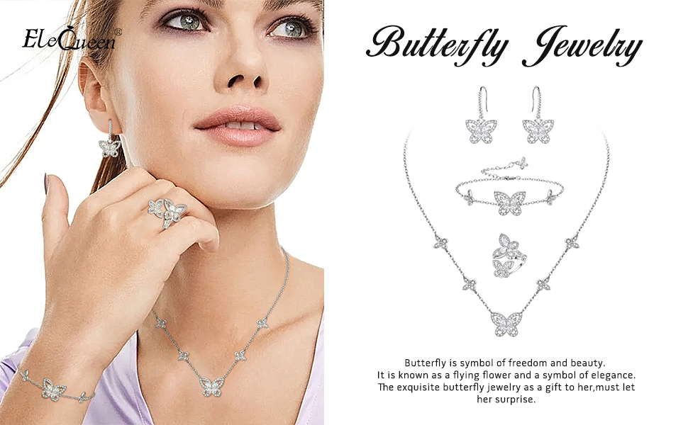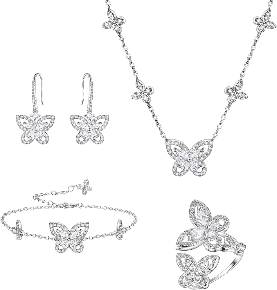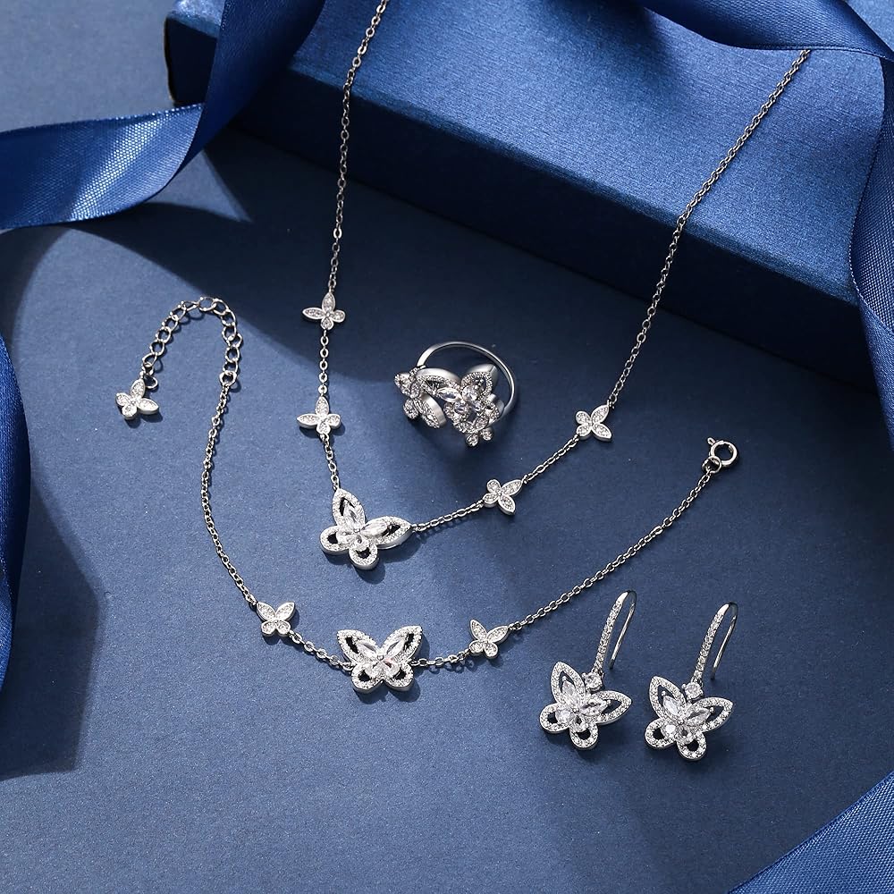 مجوهرات الفراشة من إليكوين للنساء، طقم قلادة/أقراط/خاتم/سوار مطلي بالفضة على شكل فراشات زركونيا مكعبة لمحبي الفراشات