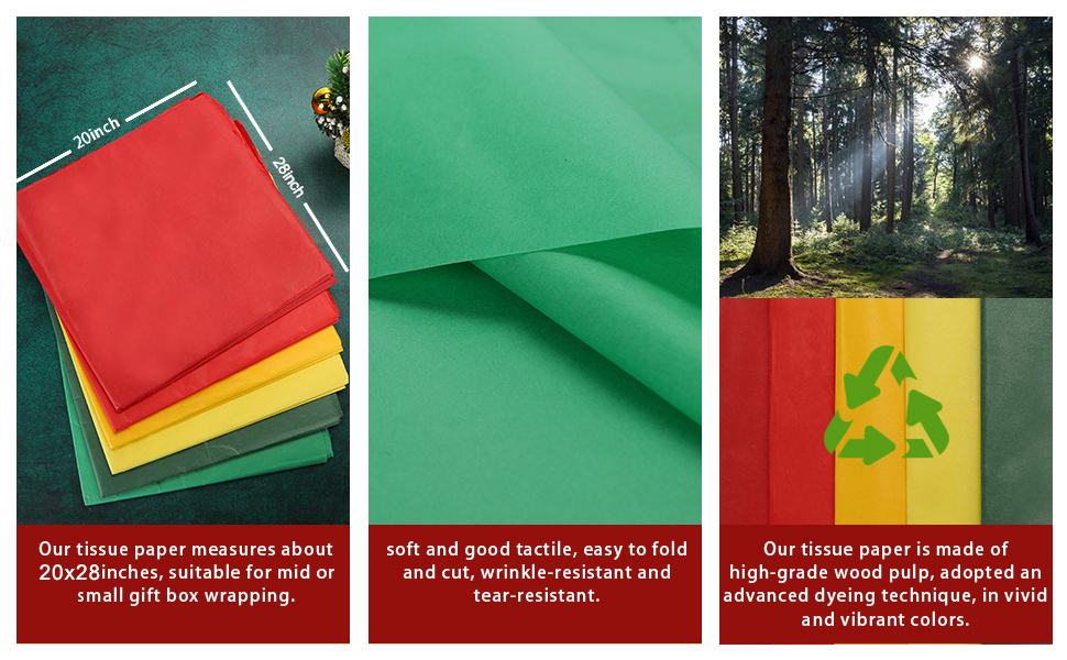 • حجم مثالي - يبلغ مقاس المناديل الورقية لدينا حوالي 20 × 28 بوصة، وهي مناسبة لأنواع مختلفة من تغليف علب الهدايا.