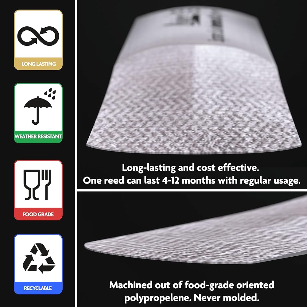 • صوت واضح ومعبّر. التوقيعات للساكسفون تستجيب دون تردد. إنها أرق وأكثر صلابة من قصب القصب التقليدي، مما يجعلها سهلة اللعب وسلسة بشكل رائع. إنها تنتج صوتًا مركزيًا نقيًا مع نغمات ملونة.