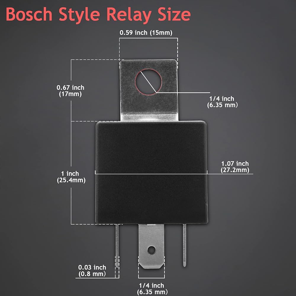 - مواصفات الأسلاك: أبيض - أرضي (85)، أزرق - VDC (30)، أسود - مشغل (86)، أحمر - مخرج N/C (87a)، وأصفر - مخرج N/O (87). تحتوي العبوة على موصلات سلكية سريعة، مما يجعل التثبيت أكثر ملاءمة!