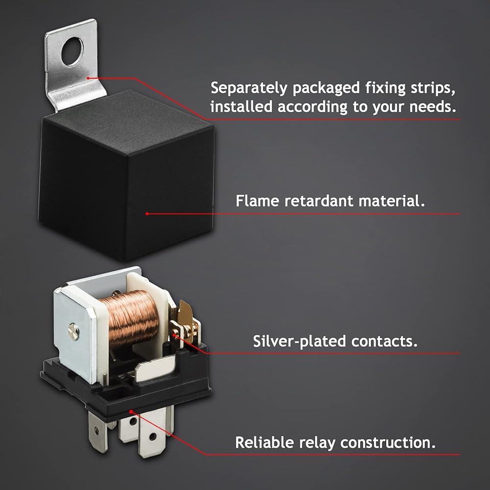 - الوظيفة: مرحل 12VDC (14V كحد أقصى) 5 Pin SPDT (رمي مزدوج أحادي القطب) مع قدرة تحويل عالية 40A/30A.