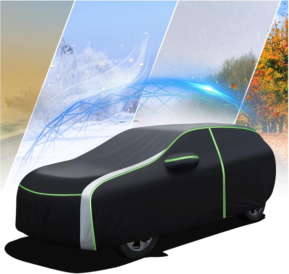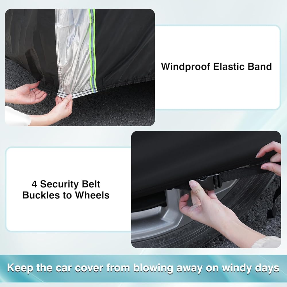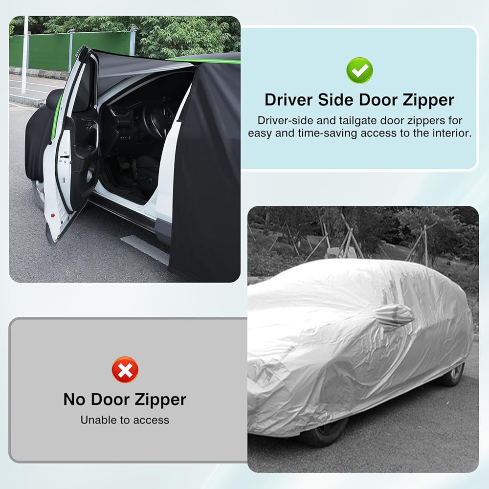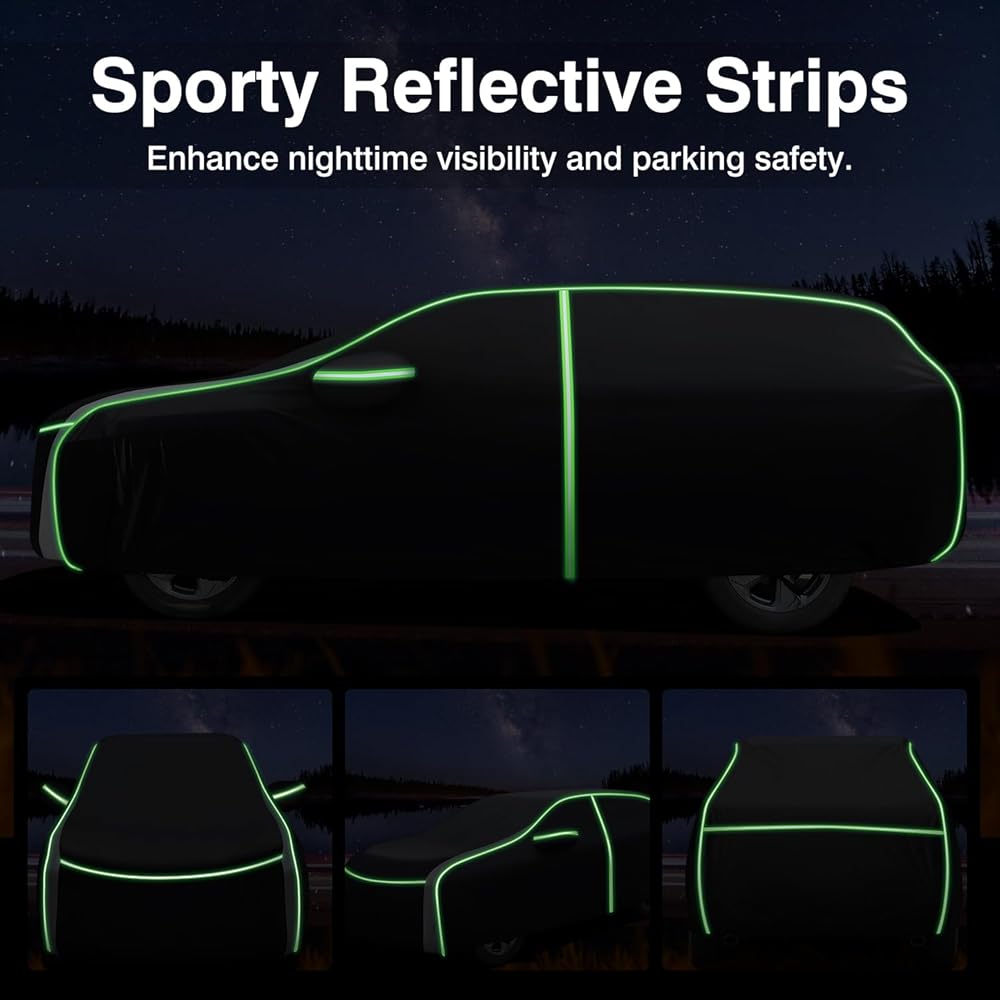 شرائط عاكسة، سحاب باب جانبي للسائق، أبازيم ثابتة: تعمل الأشرطة العاكسة الموجودة في غطاء السيارة لجميع الأحوال الجوية على تعزيز الرؤية الليلية والسلامة في مواقف السيارات. سحاب على جانب السائق لسهولة الوصول وتوفير الوقت إلى الداخل. حاشية مطاطية مقاومة للرياح و4 أبازيم مثبتة على العجلات تمنع غطاء السيارة من التطاير في الأيام العاصفة.