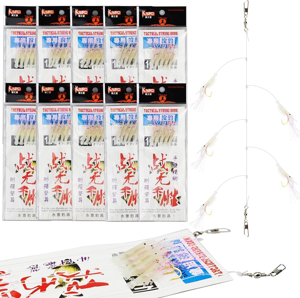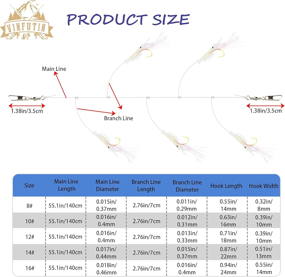 VINFUTIN sabiki rig consists of the following accessories: fishing line, luminous beads, biomimetic luminous shrimps, fish hooks,shiny silks and swivel connectors.