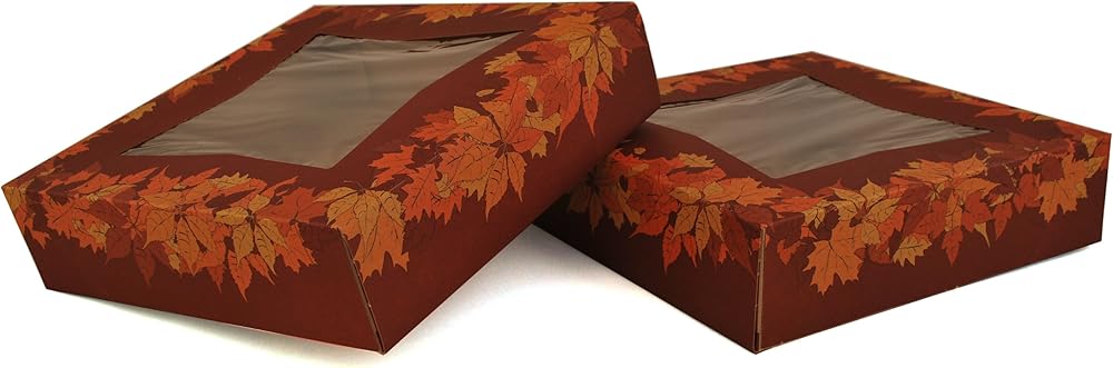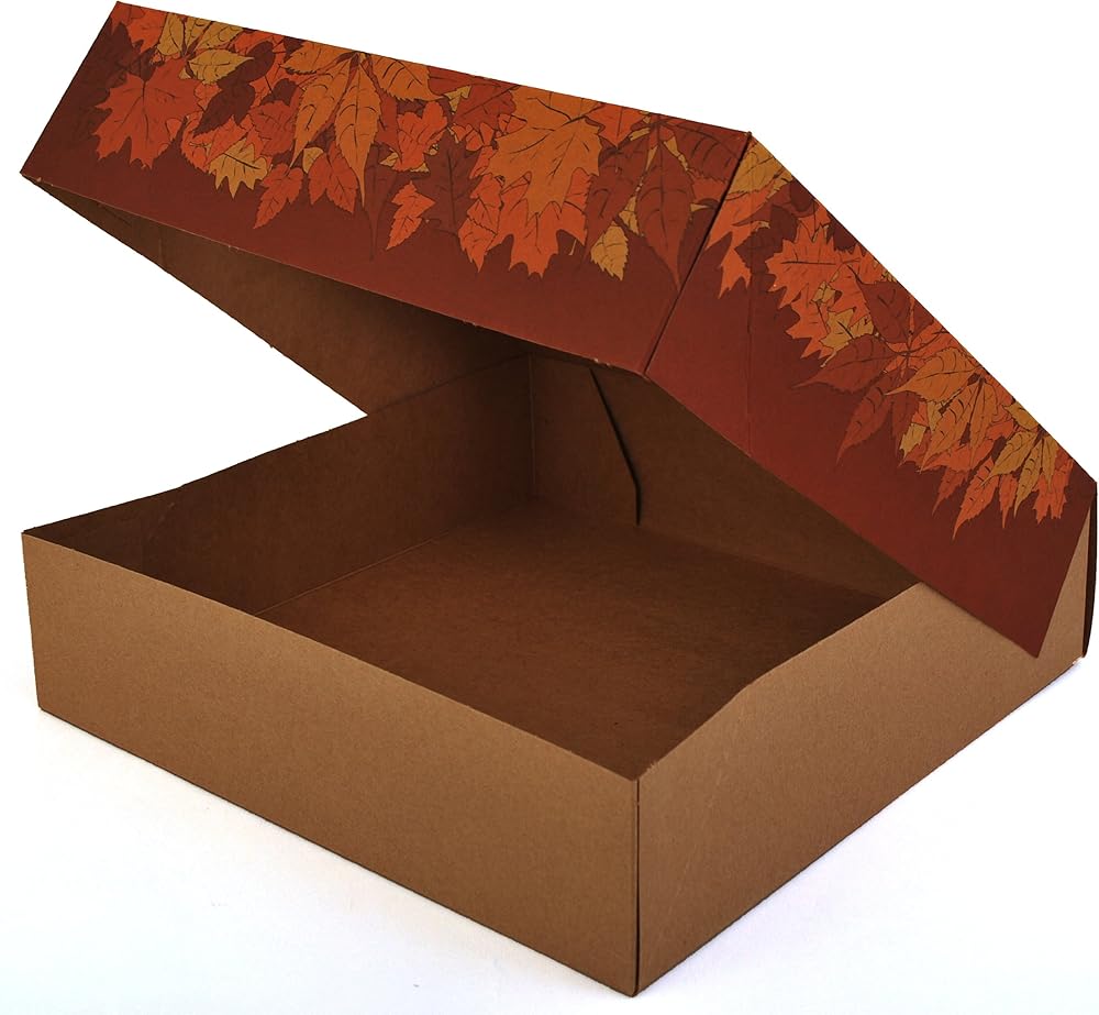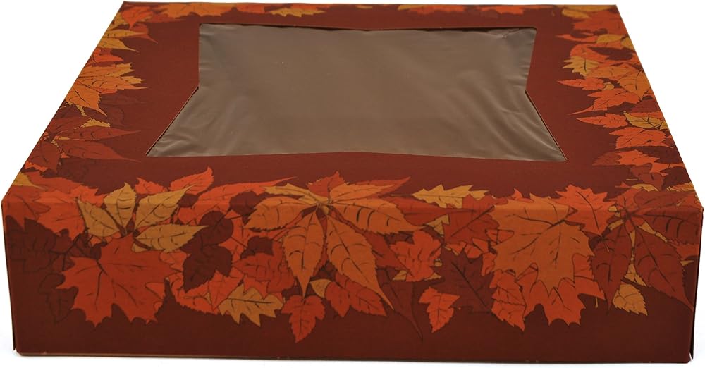 The Southern Champion Tray 2464 bakery box is made of kraft paperboard, has an autumn print on the outside and is brown on the inside, and can be used to hold and carry baked goods. Paperboard is thicker and more rigid than paper, is suitable for holding baked goods, and can be recycled or composted. The attached top flips open to insert or remove baked goods. When closed, the top fully overlaps the bottom. A cellophane window provides a view of the box's contents. Glued corners provide sturdiness. Diagonal scores allow the box to be folded flat for storage or transport. The box measures 10 x 10 x 2-1/2 inches (L x W x H). (L is length, the horizontal distance from front to back; W is width, the horizontal distance from left to right; H is height, the vertical distance from lowest to highest point.)