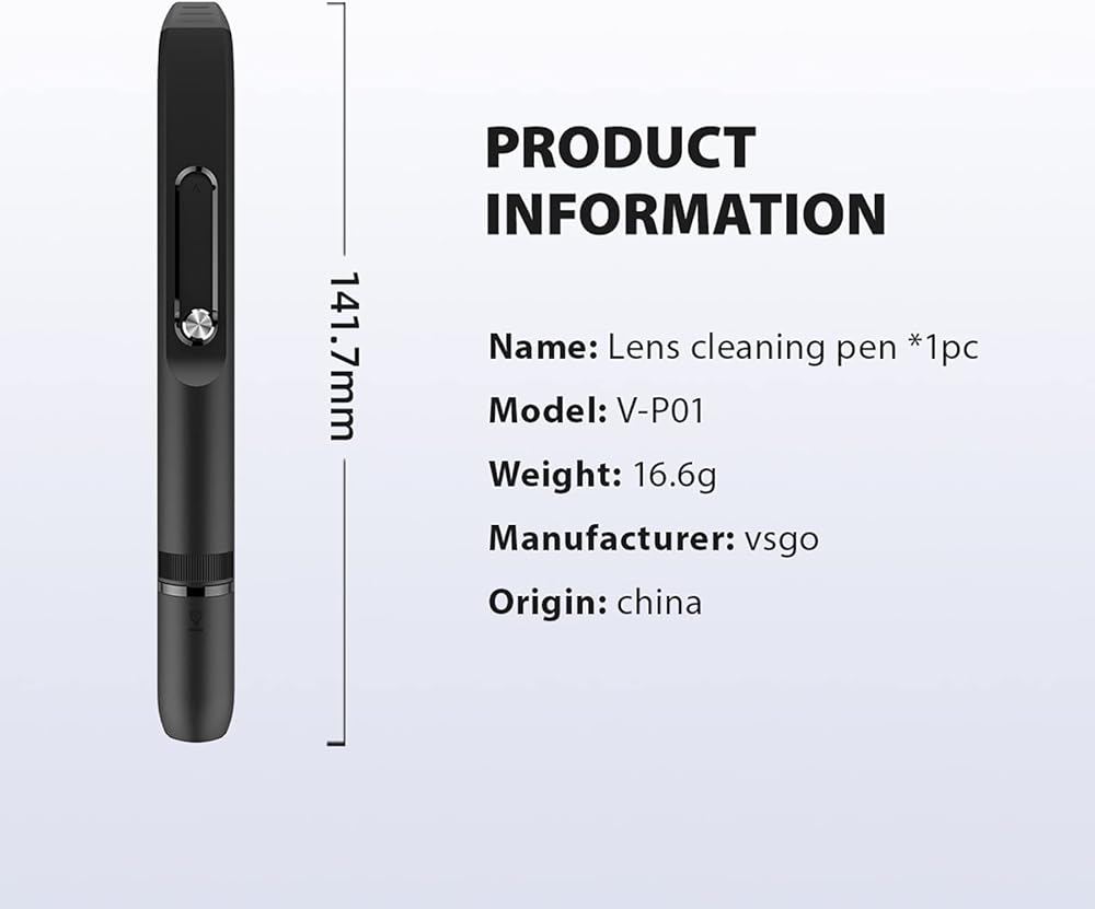 VSGO Lens Pen is a brush for cleaning optics, viewfinders, screens, binoculars and more. Lens Pen features both a dust removal brush and a cleaning head made of scratch-resistant material for cleaning the lens.The brush is made of the highest quality nylon bristles, very fine and soft, antistatic. 100% safe on every part of the camera. The cleaning head incorporates nanoparticles of activated carbon that effectively remove oily stains, fingerprints, dirt without damaging the surface treatment of the lenses. (It is recommended to use the pump to remove dust particles before using the cleaning head to avoid scratching the lens).Cleaning procedure:Place the camera pointed to the ground to drop dust particles - We recommend using a VSGO pump. Use the Lens Pen brush to remove the residual dust from the lens lens and camera body. Use the pulp head Activated carbon with gentle circular motions on the surface of the lens.Use the microfibre cloth just removed from the sealed packaging to finish removing dirt from camera lenses and screens using circular motions.