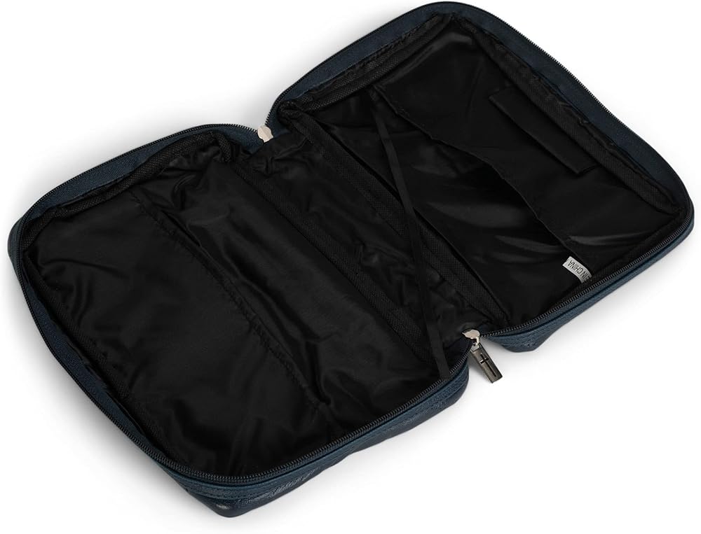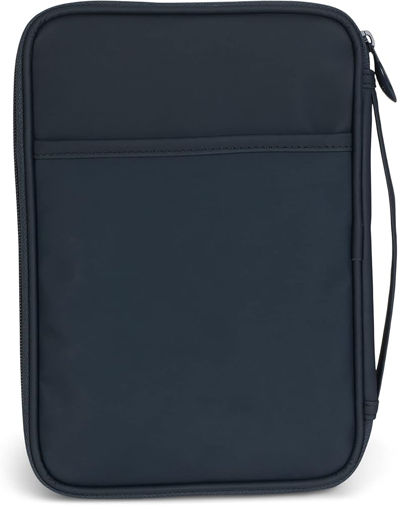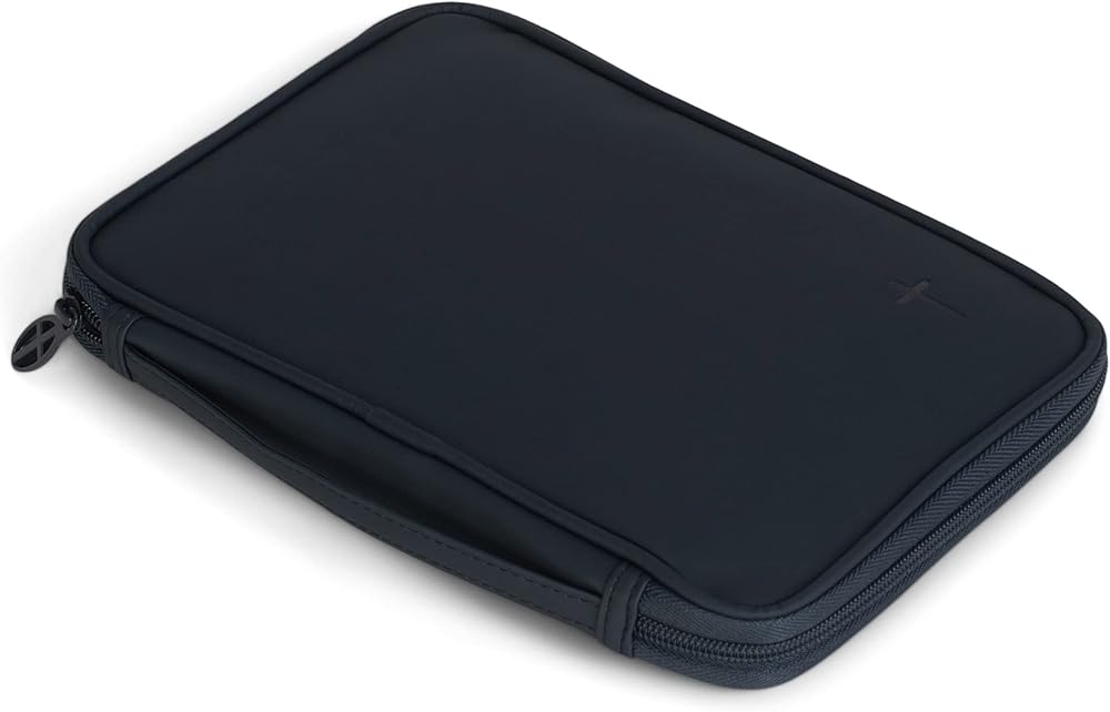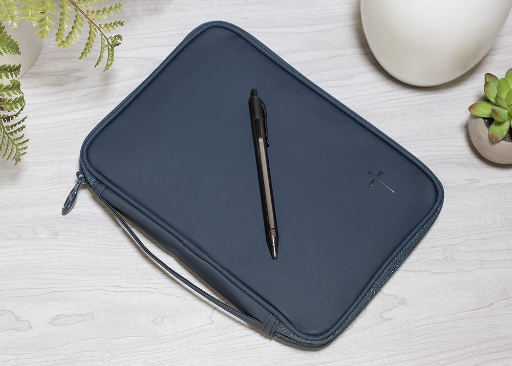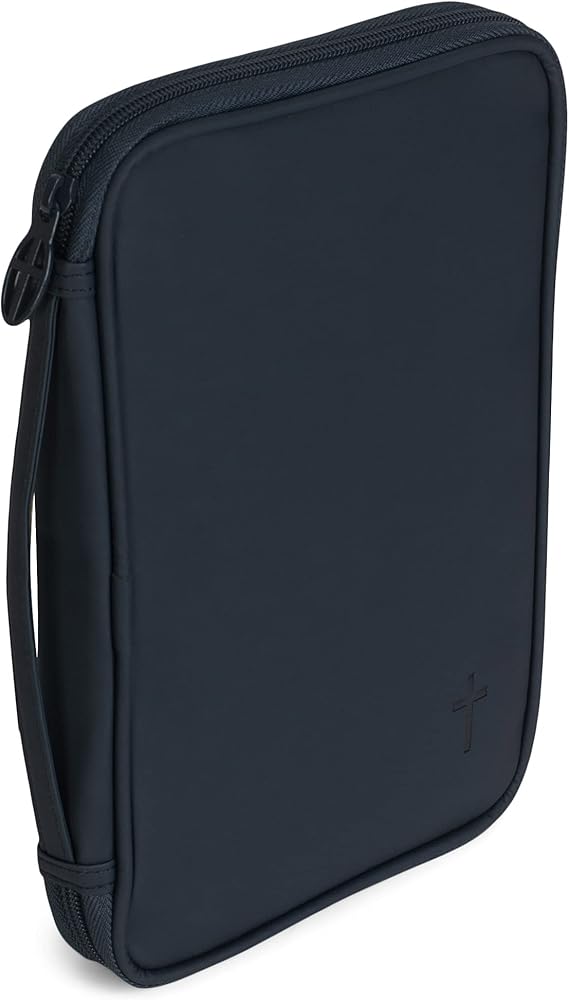 Thoughtfully designed accessory, this cover features a navy blue finish with embossed cross design; Includes a pen loop and attached ribbon bookmark. Bible cover outside dimensions measure approximately 8.5 x 6.5 x 1.75 inches and accomodates a thinline Bible or book that is 9 x 6.5 x 1 inches or smaller. Features a smooth vinyl material with a slide pocket on the back; Zipper has a cross design detail. Lays flat when open to fully view the Bible without removing; Perfect way to protect God's word. Contained in protective packaging; Ready for gifting.