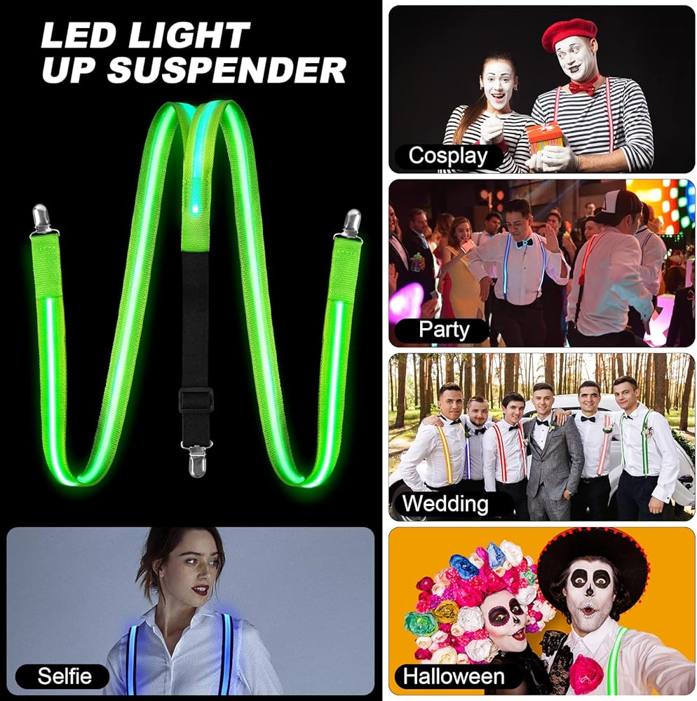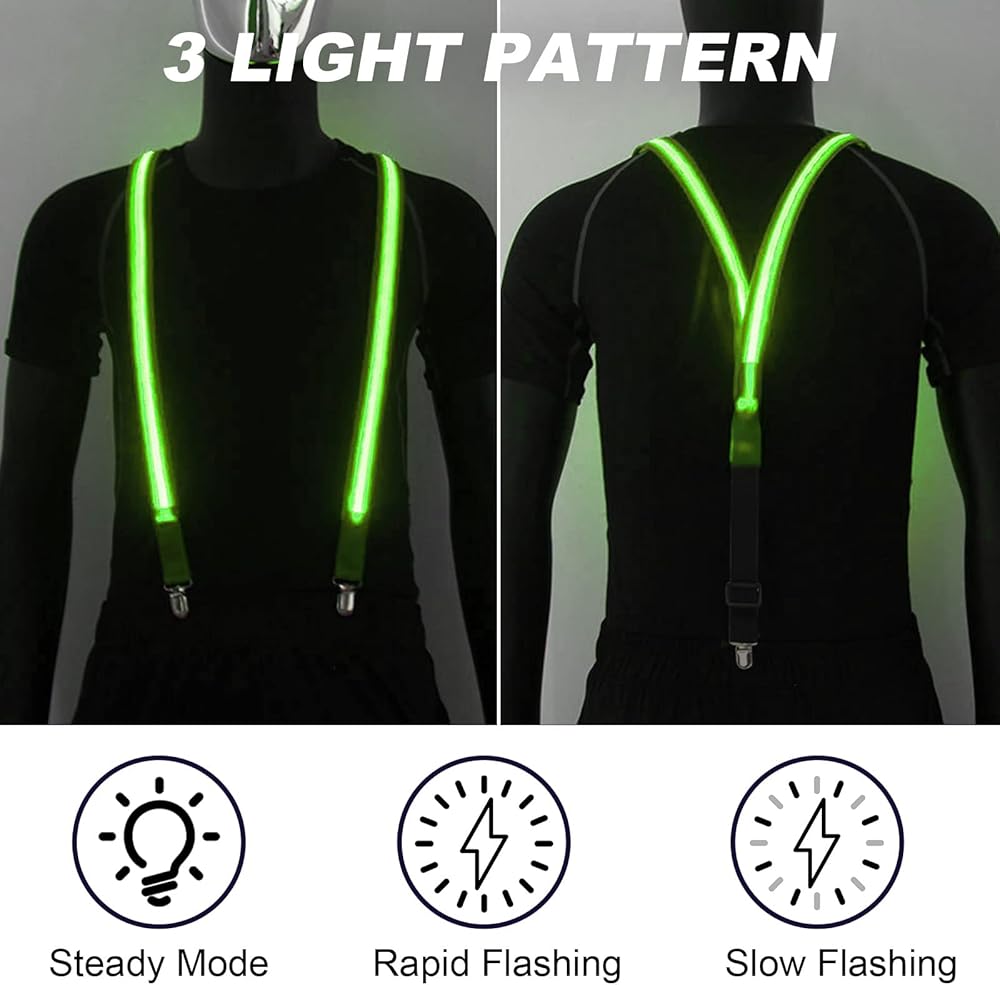 💥【3 MODES】These LED bow ties and suspenders have three lighting modes: solid light, fast flashing, slow flashing. One-button control of three lighting modes to meet your different needs. Excellent lighting effects make you stand out from the crowd. (Lights 5-10 hours depending on usage patterns.)
