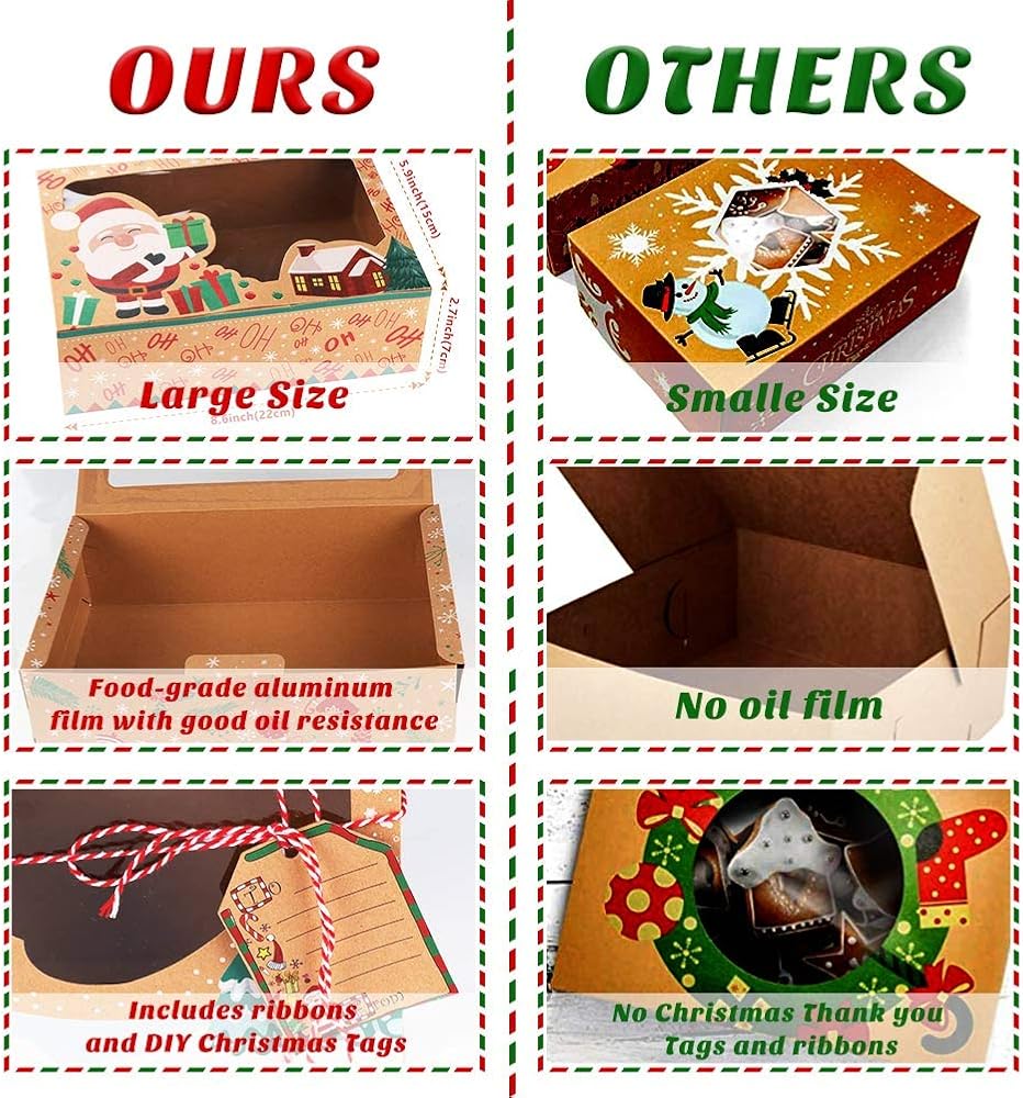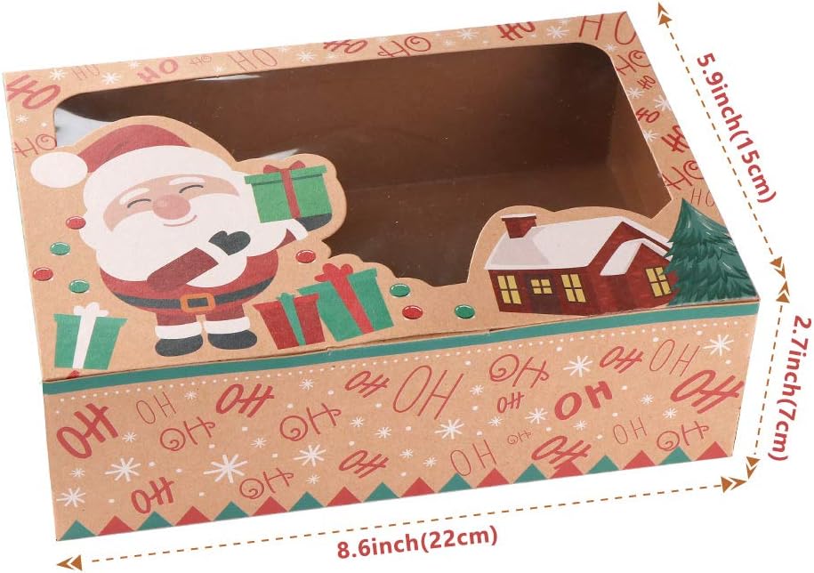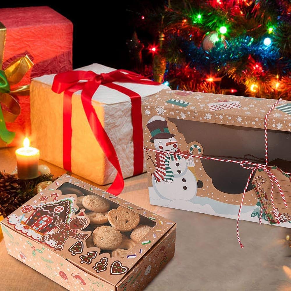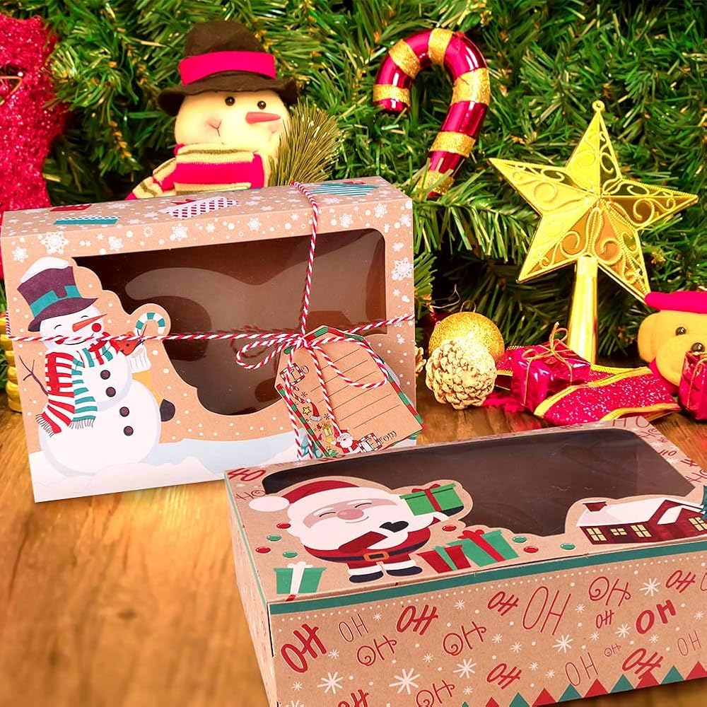 AerWo 12 حزمة من صناديق بسكويت عيد الميلاد مع نافذة، صناديق حلوى كبيرة للمخبز للعطلات مع علامات وأشرطة للنوافذ، وصناديق بسكويت عيد الميلاد للهدايا التي تقدم حاويات طعام عيد الميلاد لصالح الحفلات