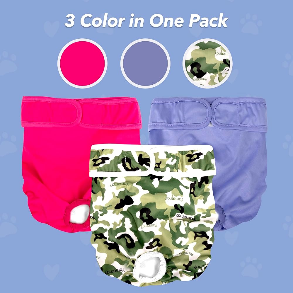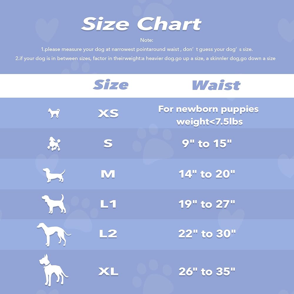 【6 مقاسات متاحة 】هناك 6 مقاسات لحفاضات الكلاب النسائية XS، S، M، L1، L2، XL. كل عبوة بها 3 ألوان.