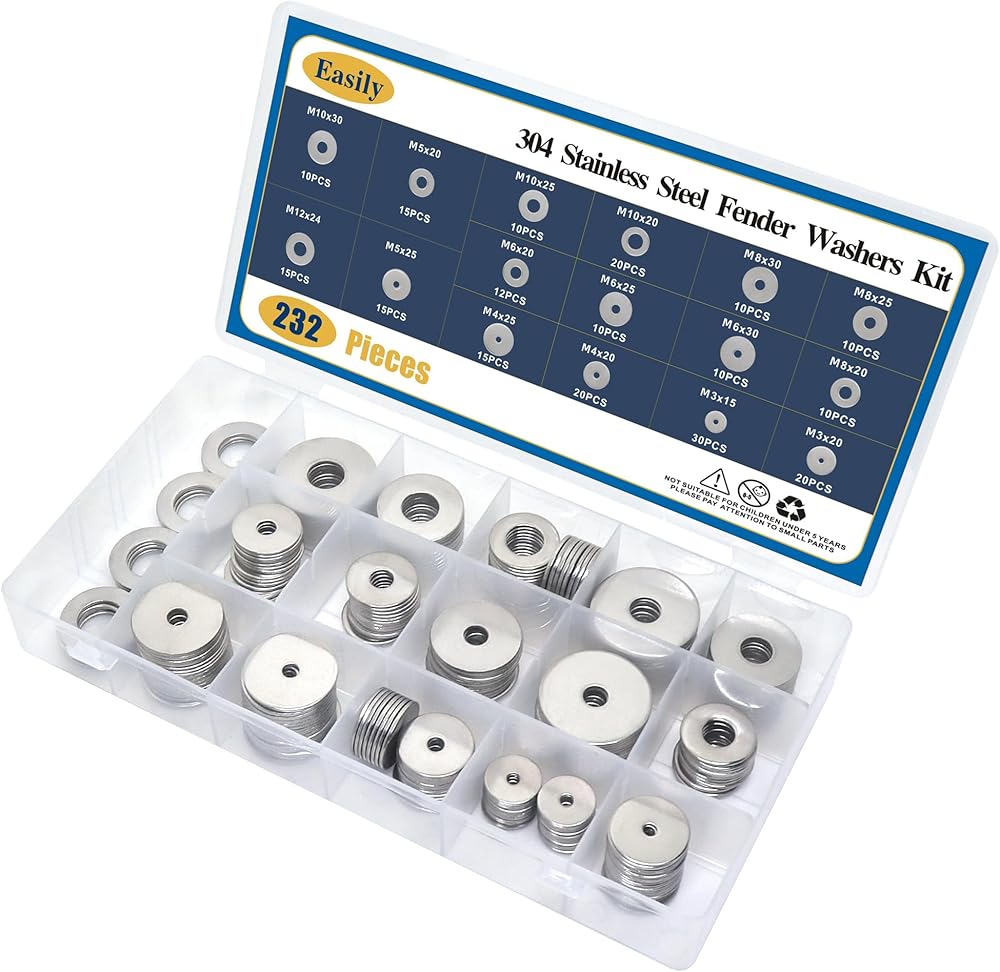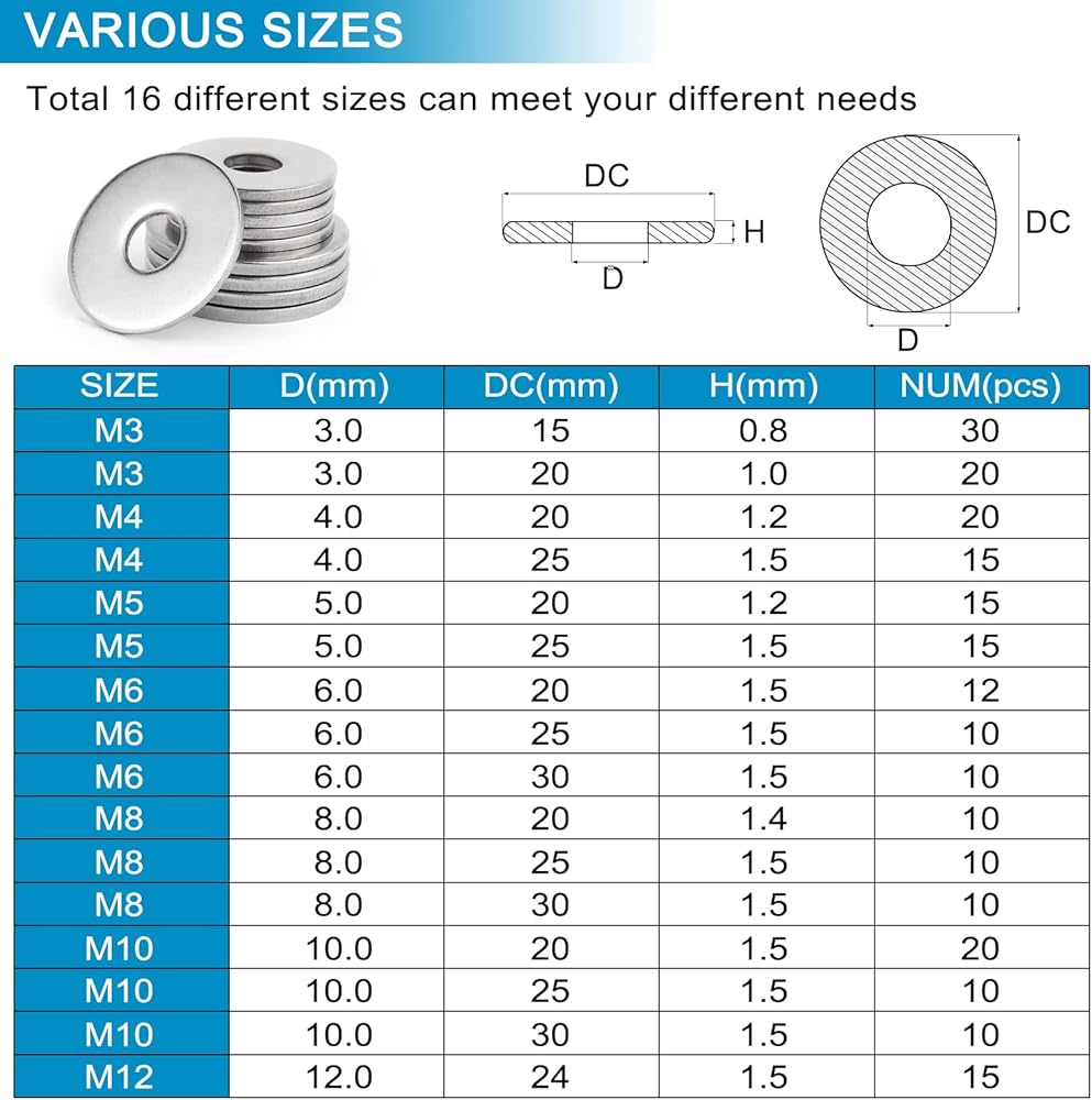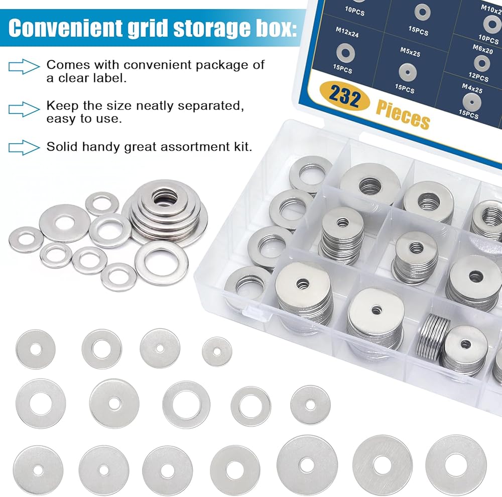 مجموعة متنوعة من غسالات الحاجز، 232 قطعة 16 مقاسًا 304 غسالات من الفولاذ المقاوم للصدأ غسالات كبيرة للاستخدام المنزلي والصناعي، مجموعة متنوعة من غسالات معدنية (M3 M4 M5 M6 M8 M10 M12)