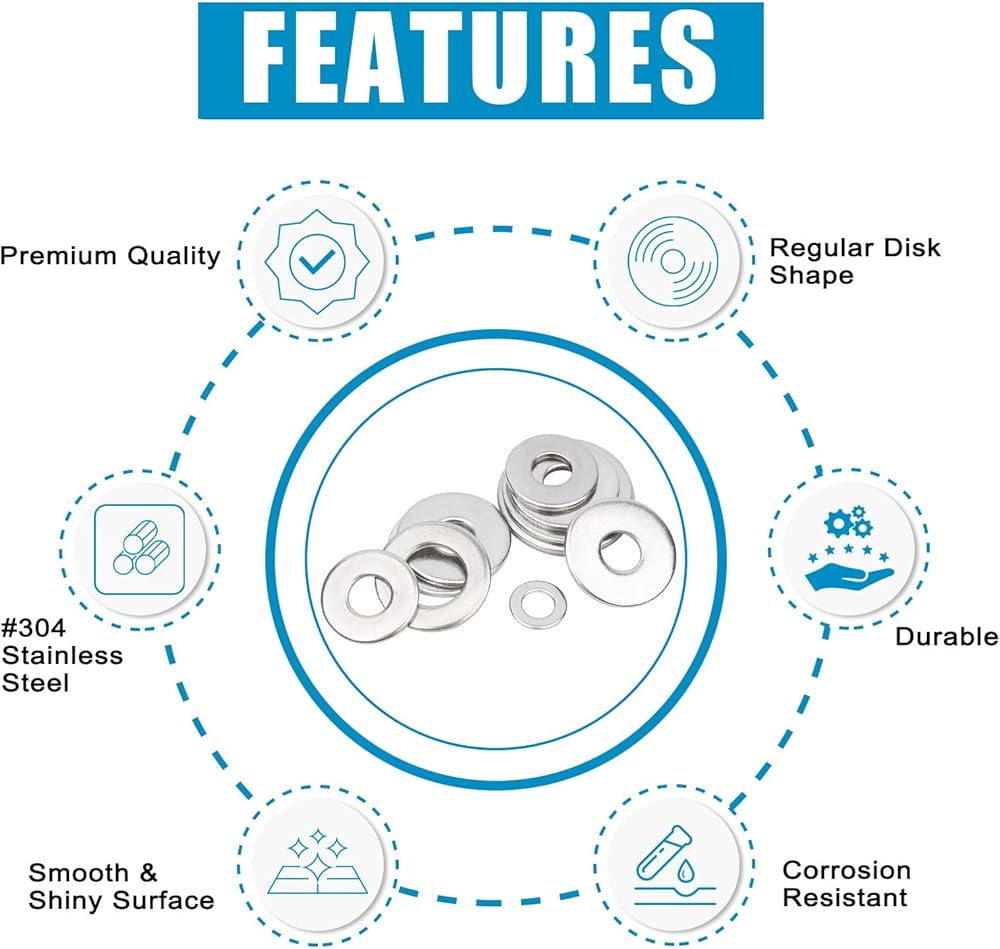 • ➤【المزايا: هذه الغسالات المصنوعة من الفولاذ المقاوم للصدأ قوية جدًا ومناسبة للاستخدام الداخلي والخارجي. القطر الخارجي الأكبر مثالي للتطبيقات التي تتطلب قدرًا أكبر من توزيع الضغط مثل الحوائط الجافة والسياج وتركيبات التثبيت والصفائح المعدنية.