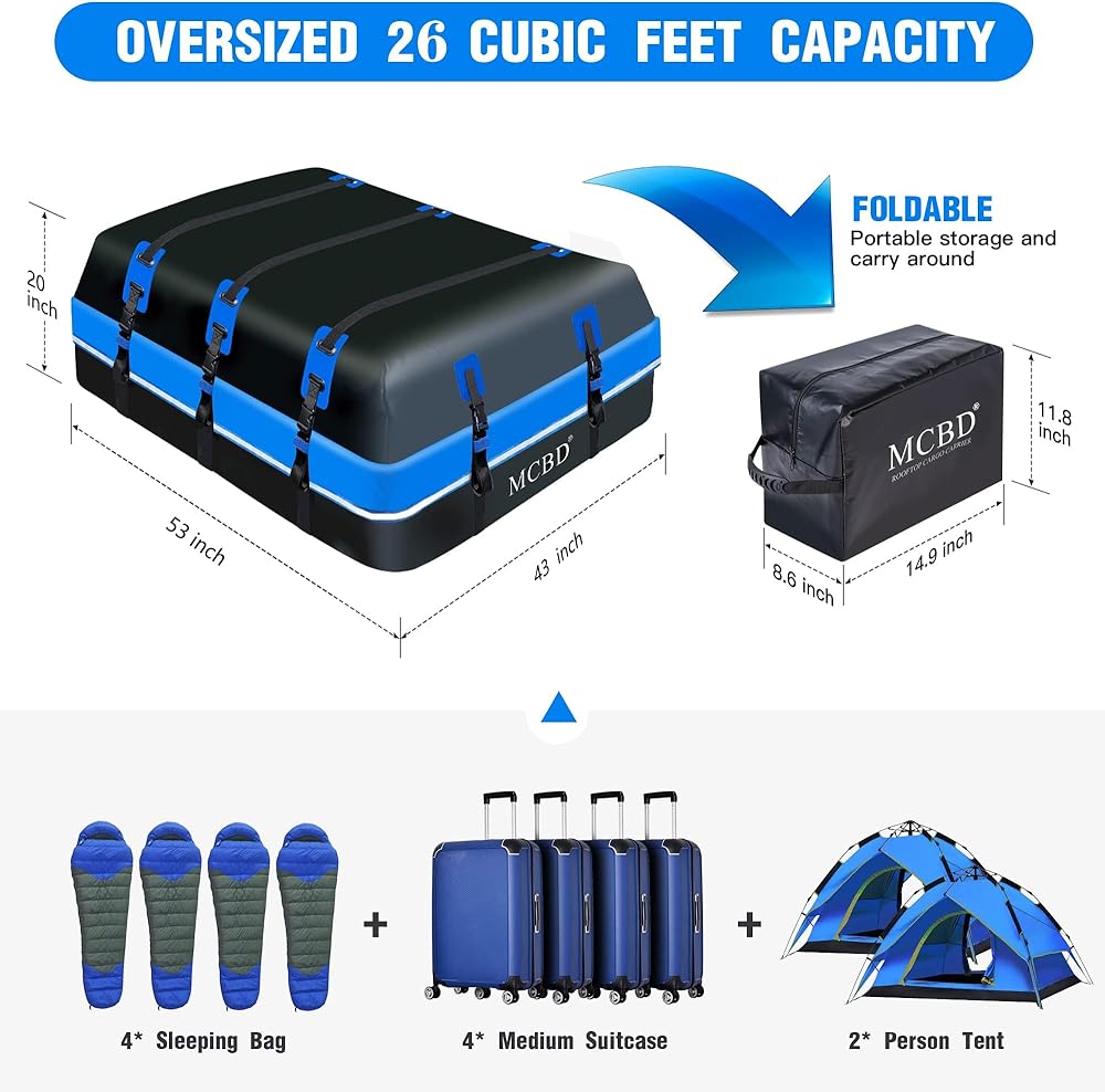 حامل شحن على السطح بطول 15 قدمًا مكعبًا: قياس 44 بوصة × 34 بوصة × 17 بوصة، تم تصميم حقيبة الشحن لحمل مجموعة متنوعة من المتعلقات، بما في ذلك الأمتعة وحقائب السفر ومعدات التخييم والمعدات الرياضية والمزيد. لتوفير مساحة أكبر داخل السيارة لرحلة برية أكثر راحة. (أزرق)