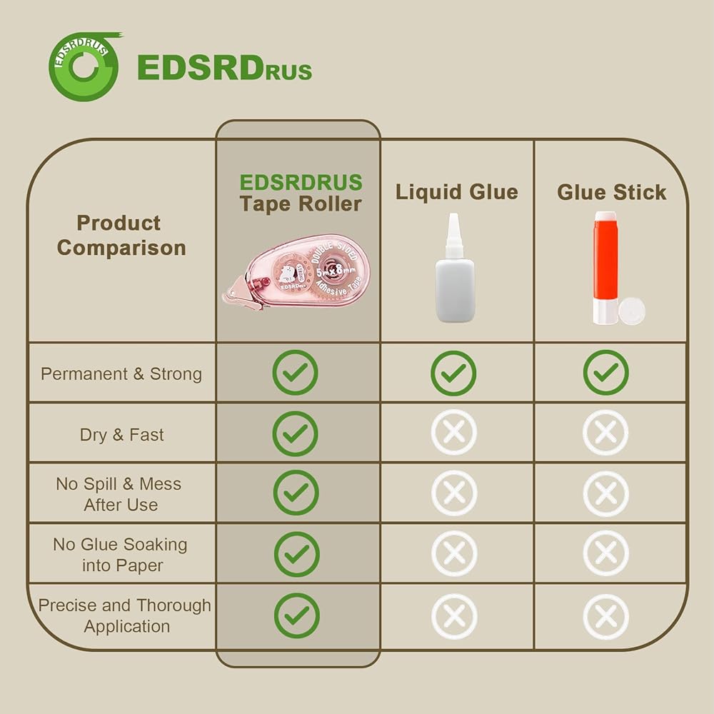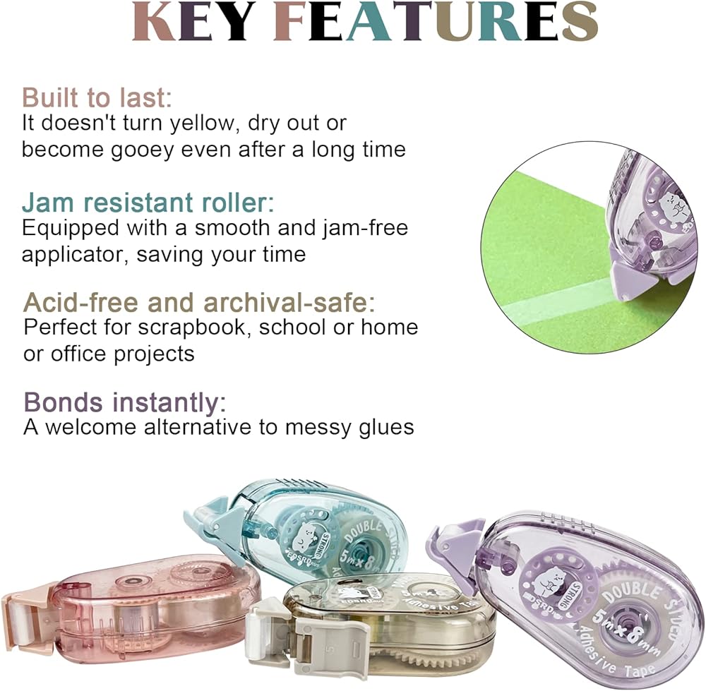 • SAFE MATERIAL:Our double-sided adhesive tape runner is made with safe materials and features scrapbook-recommended adhesive that won't gum up, clump, or wrinkle. It is acid-free, photo-safe, archival-safe, and invisible on scrapbook papers and gift-wraps, ensuring that your style and design are not compromised.