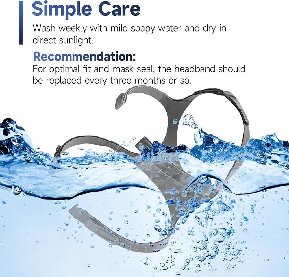 Simple Care -- Wash the Simplus headgear with mild soapy water every week, rinse with warm water, and let it dry in direct sunlight. To achieve optimal fit and mask sealing, the headband should be replaced every three months.