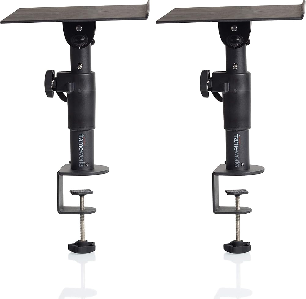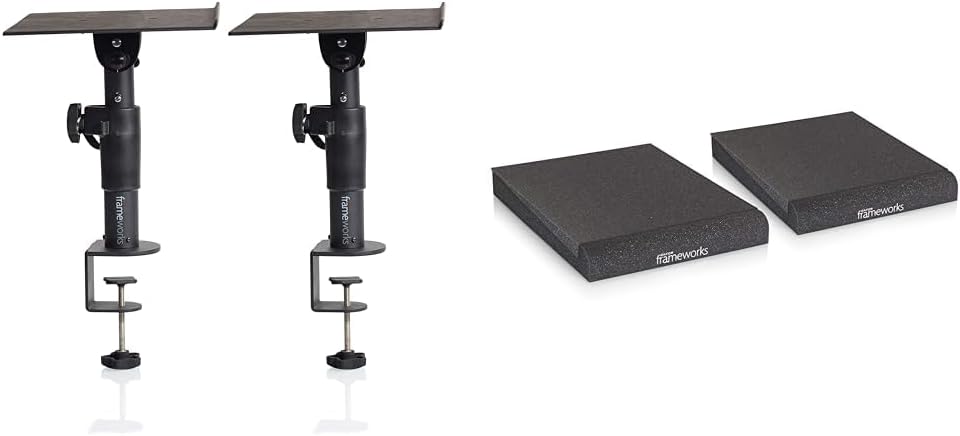 يدعم زوج الحامل المثبت على شاشة استوديو سطح المكتب من Gator Frameworks معظم شاشات الاستوديو صغيرة الحجم في كلا الاتجاهين الرأسي والأفقي لتحسين أداء مكبر الصوت أثناء التشغيل والمزج. يعمل GFWSPKSTMNDSKCMP عن طريق فصل مكبرات الصوت ورفعها عن سطح سطح المكتب لديك، مما يمنحك استجابة صوتية أكثر عزلة لتحسين الدقة أثناء مراقبة الاستوديو. يمكنك ضبط وقفل ارتفاع الحامل بسهولة من 10.5 بوصة إلى 14 بوصة وزاوية إمالة مكبر الصوت من 0 إلى 15 درجة لتحديد الموضع المفضل. يتم تثبيت الحامل على أسطح سطح المكتب التي يصل سمكها إلى 2.25 بوصة لتوفير مساحة على طاولة محطة العمل الخاصة بك وسوف تحمل حمولة قصوى تبلغ 60 رطلاً. بالإضافة إلى شاشات الاستوديو، تعمل منصة السطح العلوي متعددة الأغراض بشكل رائع مع طرازات MacBook Air/Pro وسوف تناسب أجهزة الكمبيوتر المحمولة ذات الحجم المماثل.