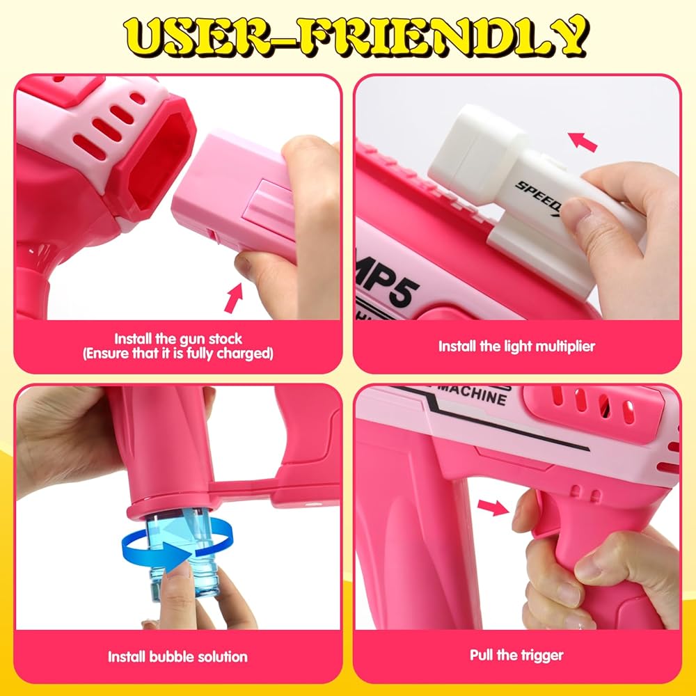 عملية سهلة: تشغيل مسدس الفقاعات بسيط وخالي من المتاعب. ما عليك سوى إدخال مسدس البندقية، وتثبيت مصابيح LED، وتثبيت زجاجات الفقاعات على البندقية، ثم سحب الزناد لتوليد دفق مستمر من الفقاعات تلقائيًا. لا حاجة لغمس الماء، وهو مانع للتسرب. إنها طريقة سهلة لخلق جو مبهج للأطفال.