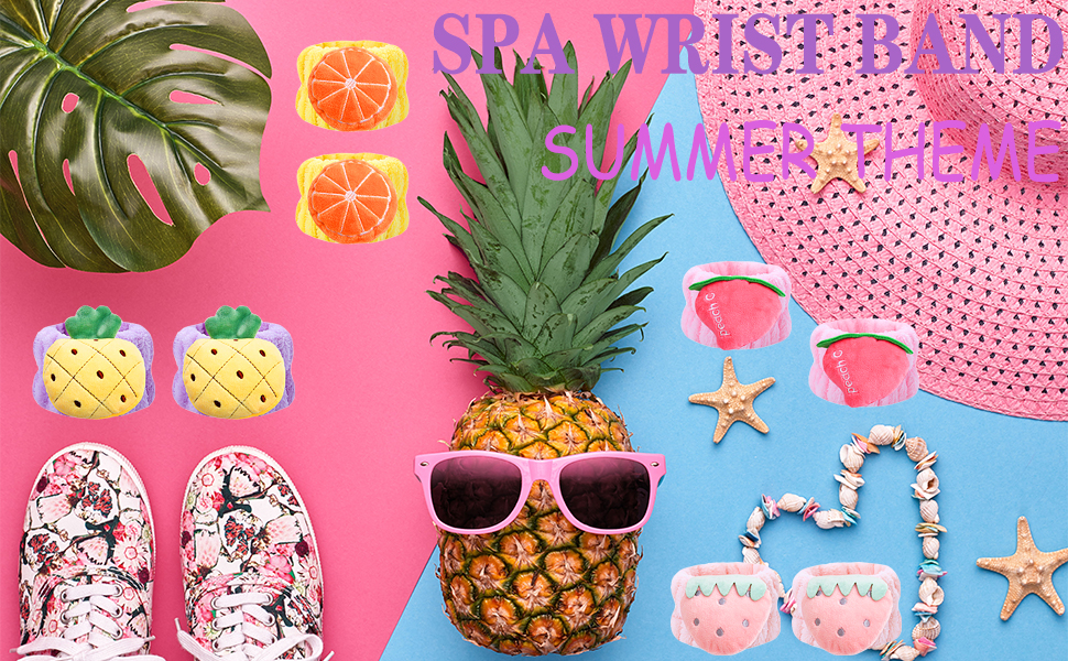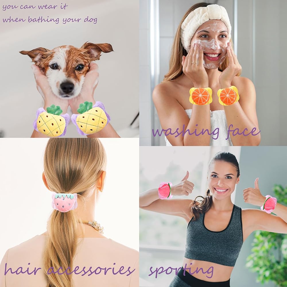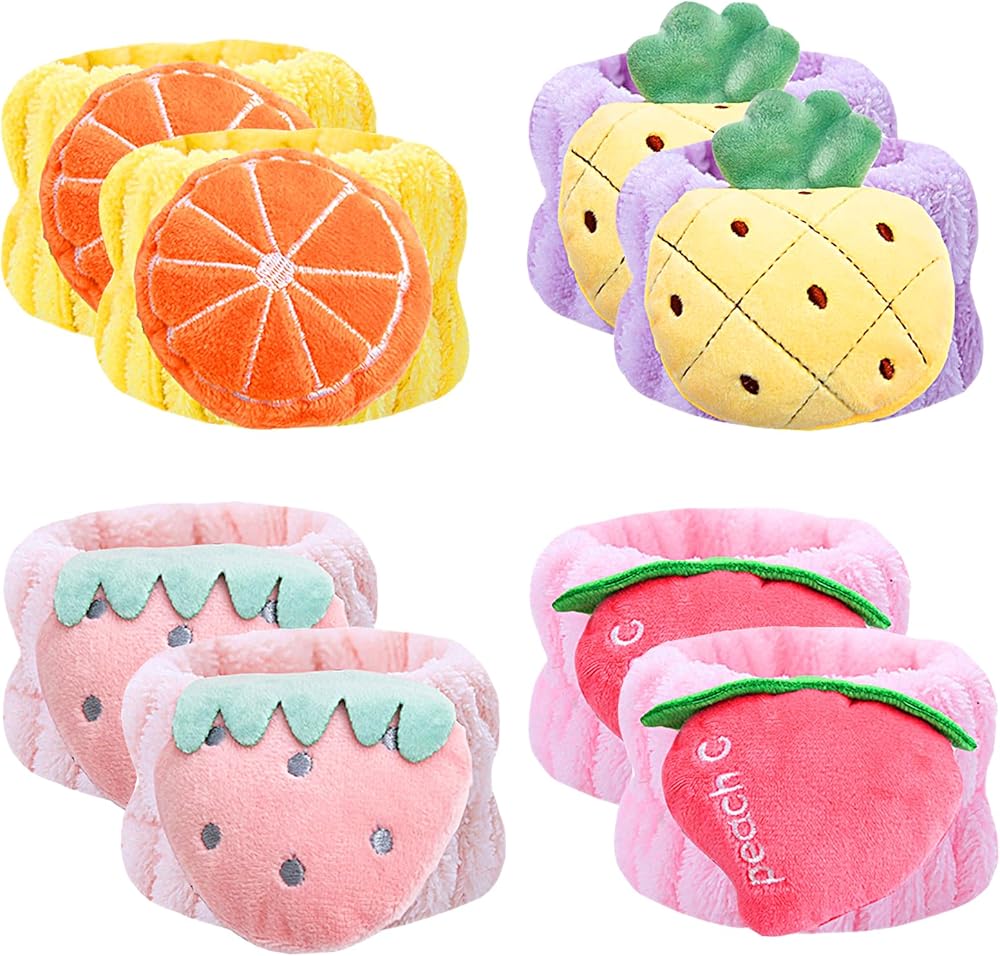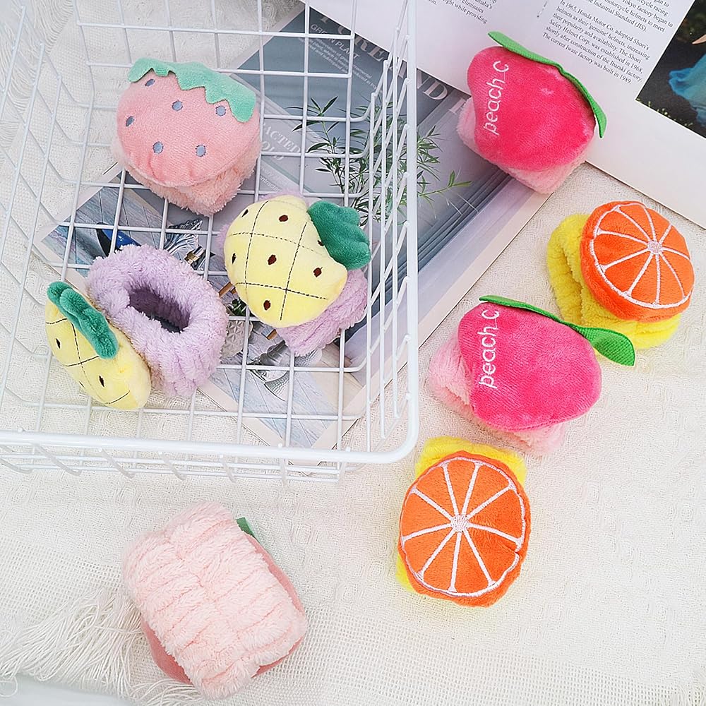 مجموعة أحزمة غسيل المعصم الصيفية - هناك 4 أزواج من أساور المعصم المصنوعة من الألياف الدقيقة بأربعة ألوان مختلفة مع دمية فاكهة مختلفة، الخوخ، الفراولة، الأناناس، البرتقالي، الجميلة والملونة، ستمنحك مزاجًا جيدًا