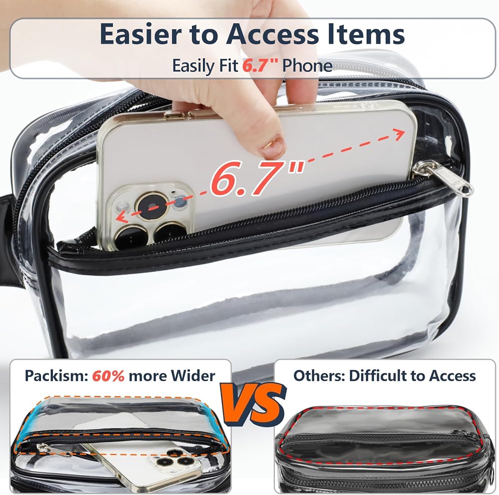 ▶Clear Bag Stadium Approved - Black clear sling bag size 7.1"Lx 3.4"Wx10.2"H and Black clear purse size 8.7“L x 2.6" W x 5.9"H", Comply with clear bag policies effortlessly! (approved size: 12x6x12 inches), Packism's see-through small clear purse gets you through security swiftly, perfect for concerts and any stadium sports events.