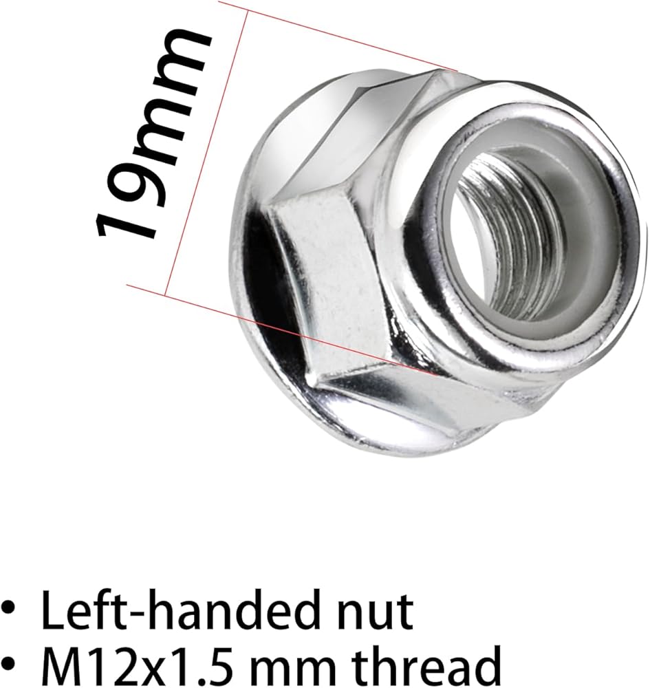 - Left-handed nut, M12x1.5 mm thread 19 mm hex nut size.