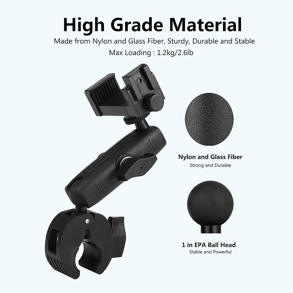 • 【ثبات فائق】 حامل هاتف عربة الجولف يستخدم مادة الألياف الزجاجية والنايلون، وليس البلاستيك، ومقاوم لأشعة الشمس ومضاد للشيخوخة، ويوفر قوة تثبيت قوية، ويجعل الهواتف أكثر أمانًا وأمانًا، ولا ينجرف عند لمسها أو استخدمه، أقصى حمل يصل إلى 1 كجم/2.2 رطل