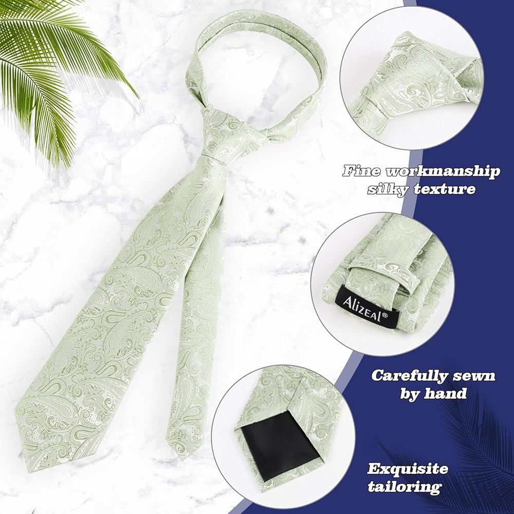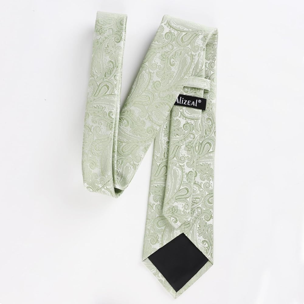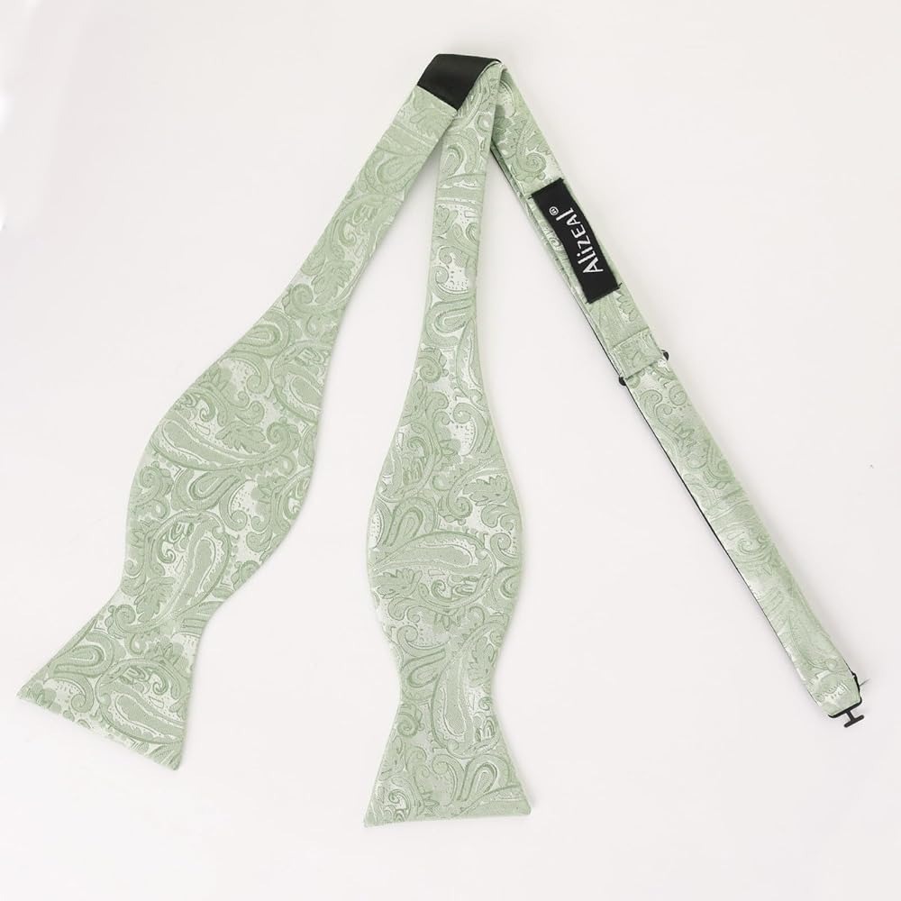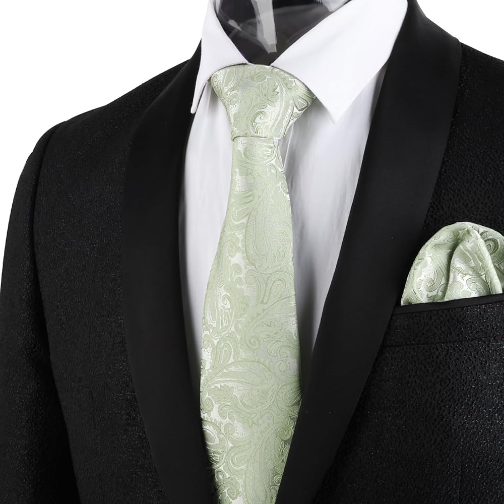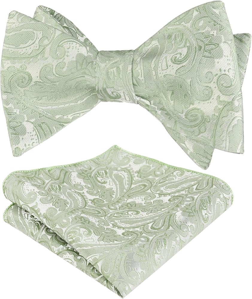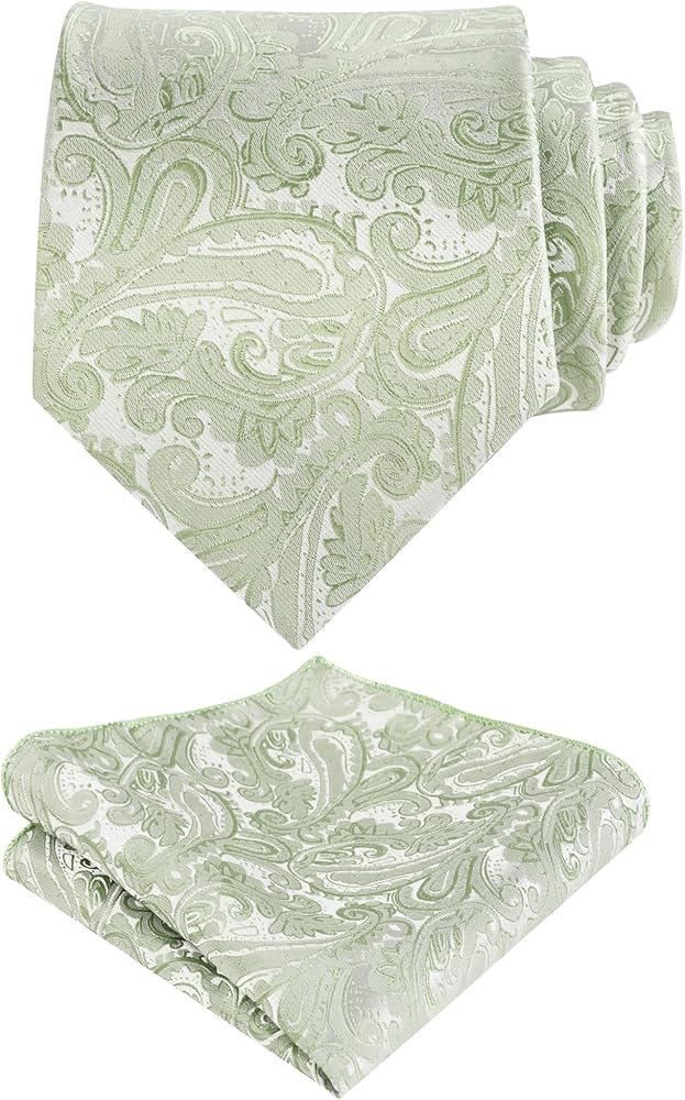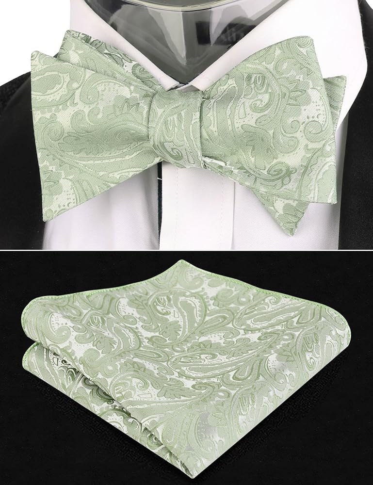 Sage Green Mens Paisley Floral Tie Handkerchief Wedding Necktie Set and Mens Paisley Jacquard Self-Tie Bow Tie Pocket Square Set
