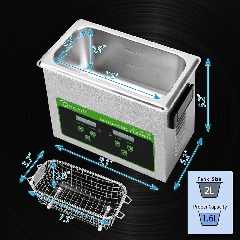 【سعة كبيرة】- مع خزان تنظيف كبير من الفولاذ المقاوم للصدأ سعة 2 لتر/67.6 أونصة، ويأتي منظف المجوهرات الاحترافي بالموجات فوق الصوتية مع سلة من الفولاذ المقاوم للصدأ، يناسب جميع احتياجاتك، وتنظيف أجزاء مسدس نظارات المجوهرات، إلخ. تنظيفك سهل ومحمول.