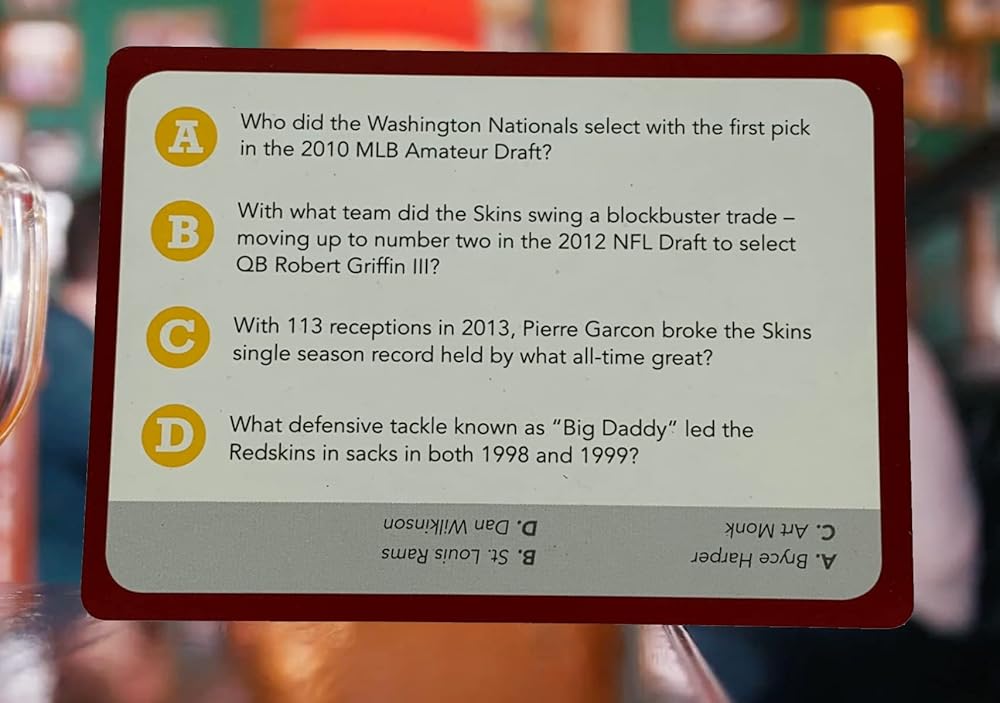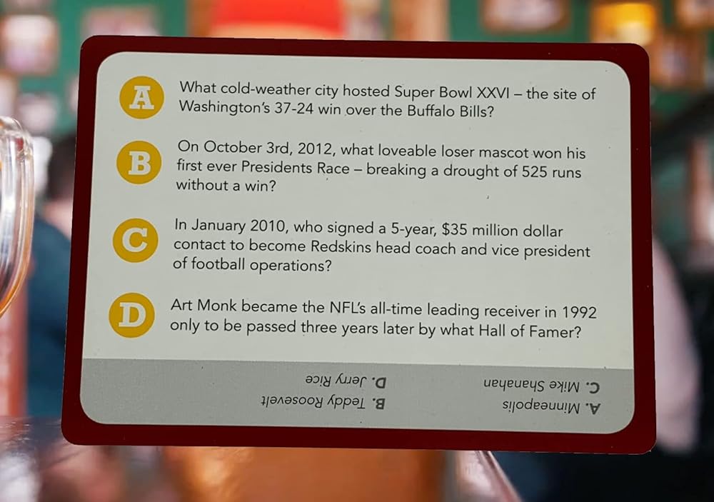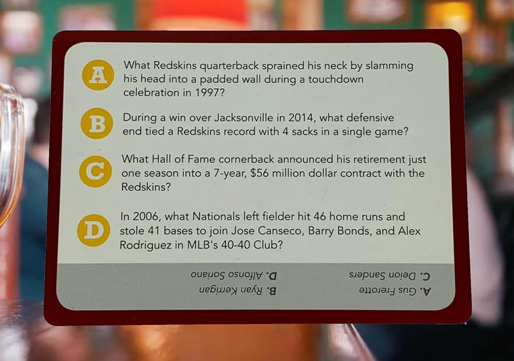 You Gotta Know Washington is the addictive sports trivia game made just for Washington (DC) sports fans. With 500 questions, there's something for everyone from the casual fan to the obsessed sports geek. Football. Baseball. Basketball. Hockey. Players. Coaches. Trades. Draft picks. Numbers and records. Buildings, ballparks, and arenas. It's all here. Each card has a point value (based on difficulty) for easy "race to 21" game play... or just ask the questions to your buddies while you're drinking beer.