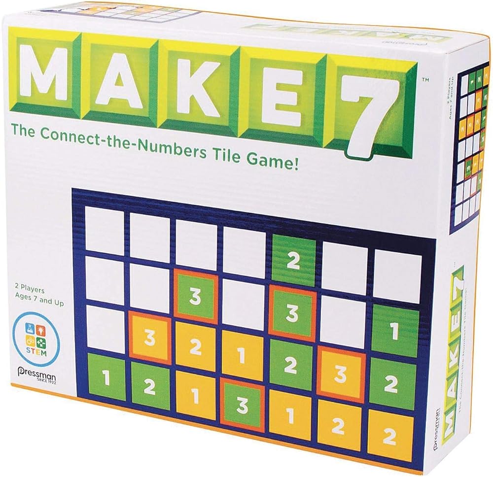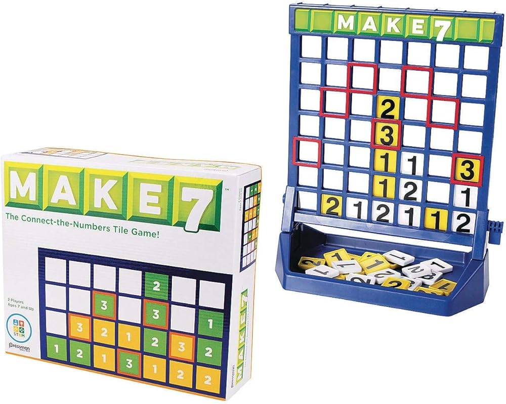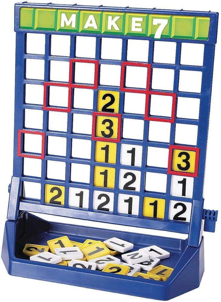 Make 7 kids game. Try to get your number tiles to add up to 7 in any direction to win. Deluxe plastic game console base.52 number tiles (26 of each color), and labels. For 2 players. Ages 7 to adult.