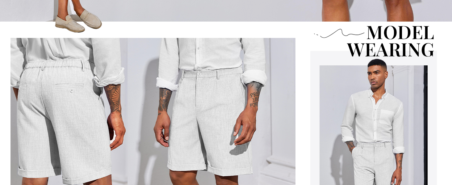 المطابقة: يمكن ارتداء شورتات العمل الكاجوال للرجال مع قمصان الفساتين وقمصان البولو للحصول على مظهر رسمي، أو إقرانها مع قميص كاجوال للحصول على مظهر أكثر راحة. توفر سراويلنا متعددة الاستخدامات التنوع والرقي الخالد.