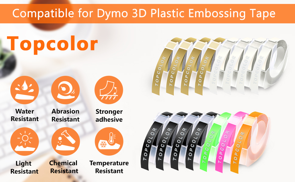 تأثير ثلاثي الأبعاد فريد من نوعه: يتميز شريط الملصق البلاستيكي المنقوش Topcolor بحروف مرتفعة للحصول على تأثير ثلاثي الأبعاد يساعدك على تحديد الأجزاء الأكثر أهمية بسهولة أكبر. الخطوط المقعرة والمحدبة تجعل لمستك أكثر واقعية. إنها مرنة، ولها التصاق قوي، ومقاومة للماء، ومقاومة للبهتان، ومقاومة للتآكل، ومقاومة للمواد الكيميائية، ومقاومة لدرجات الحرارة العالية أو المنخفضة بالإضافة إلى مقاومة الشحوم.