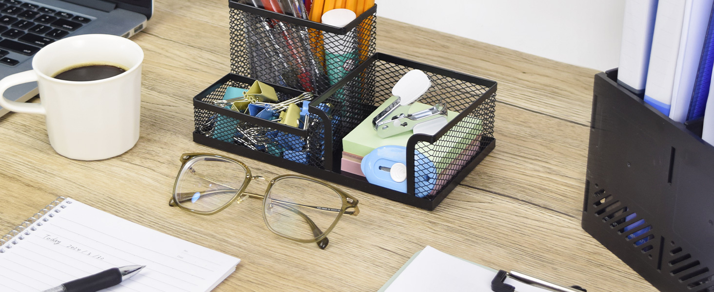 • قاعدة مضادة للانزلاق: حامل قلم رصاص لأسفل المكتب مع 4 وسادات مضادة للانزلاق، والتي يمكن أن تمنعه ​​من الانزلاق ويمنع أيضًا خدش الطاولة بشكل مثالي. التصميم المجوف الشبكي لمنظمات سطح المكتب يجعل صندوق التخزين ليس من السهل تراكم الغبار وسهل التنظيف.