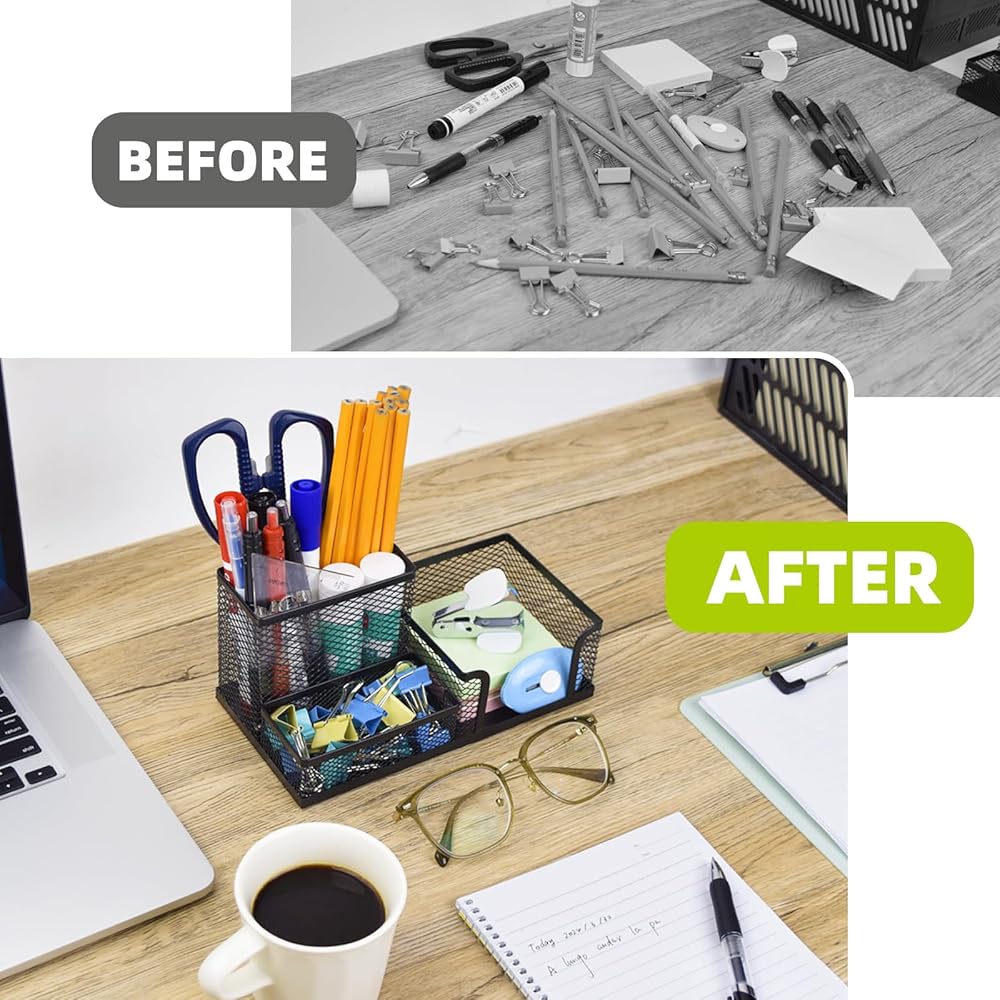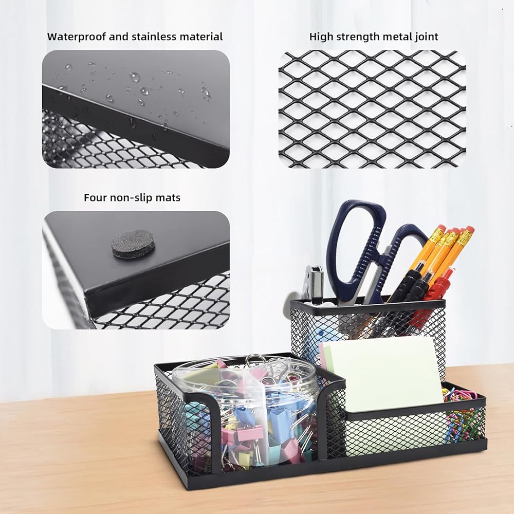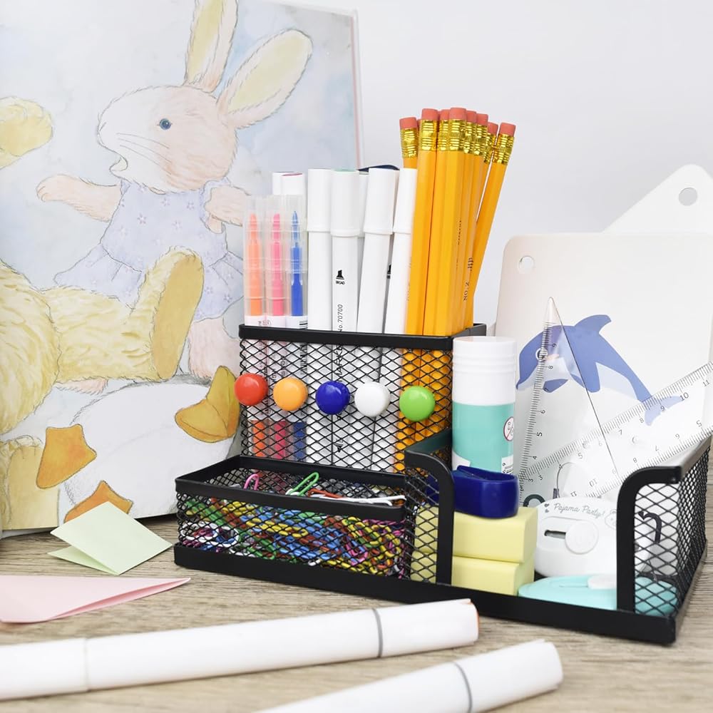 • منظم مكتب مثالي: يتكون حامل الأقلام الشبكي Happy Seal من 3 أقسام، والتي يمكن أن تتيح لك فصل الأقلام والمقص والمساطر وعصي الغراء ومشابك التثبيت والملاحظات اللاصقة ونقاط الملصقات والمسامير. يعزز هذا التصميم بيئة مكتبية منظمة، ابدأ يومك بمساحة عمل مرتبة ومرتبة جيدًا.