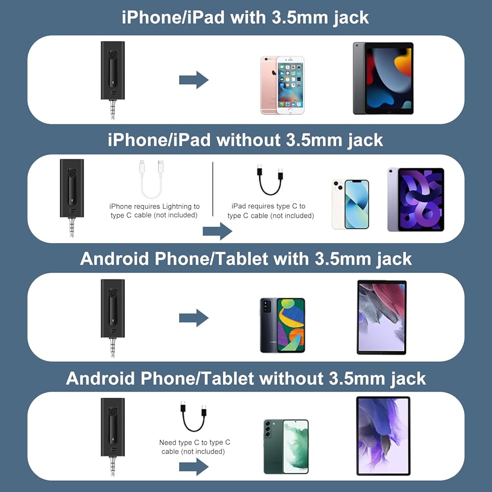 التوصيل والتشغيل والاتصال التلقائي: لا حاجة إلى برنامج تشغيل أو بلوتوث أو تطبيق. ما عليك سوى اختيار المحول المناسب لأجهزتك، وتوصيل جهاز الاستقبال بأجهزتك، ثم قم بتشغيل الميكروفون وجهاز الاستقبال، وسوف يقترن هذان الجزءان تلقائيًا.