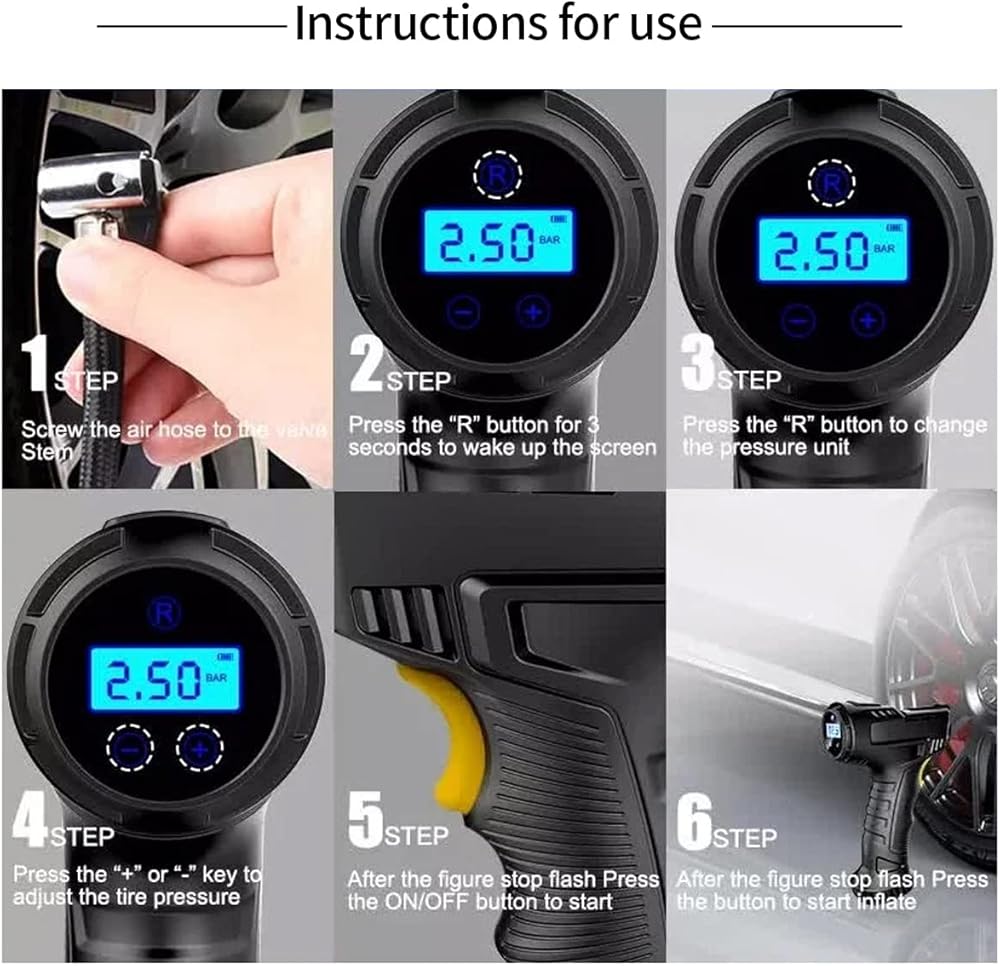 • * The product adopts metal cylinder, which has stable and fast heat dissipation, reduces the heat of the body during use, and reduces noise at the same time. Maximum pressure 150 PSI. Simply plug our car tire inflator into a 12V cigarette lighter and it only takes 7.5 minutes to fully inflate a car tire (0-36PSI).