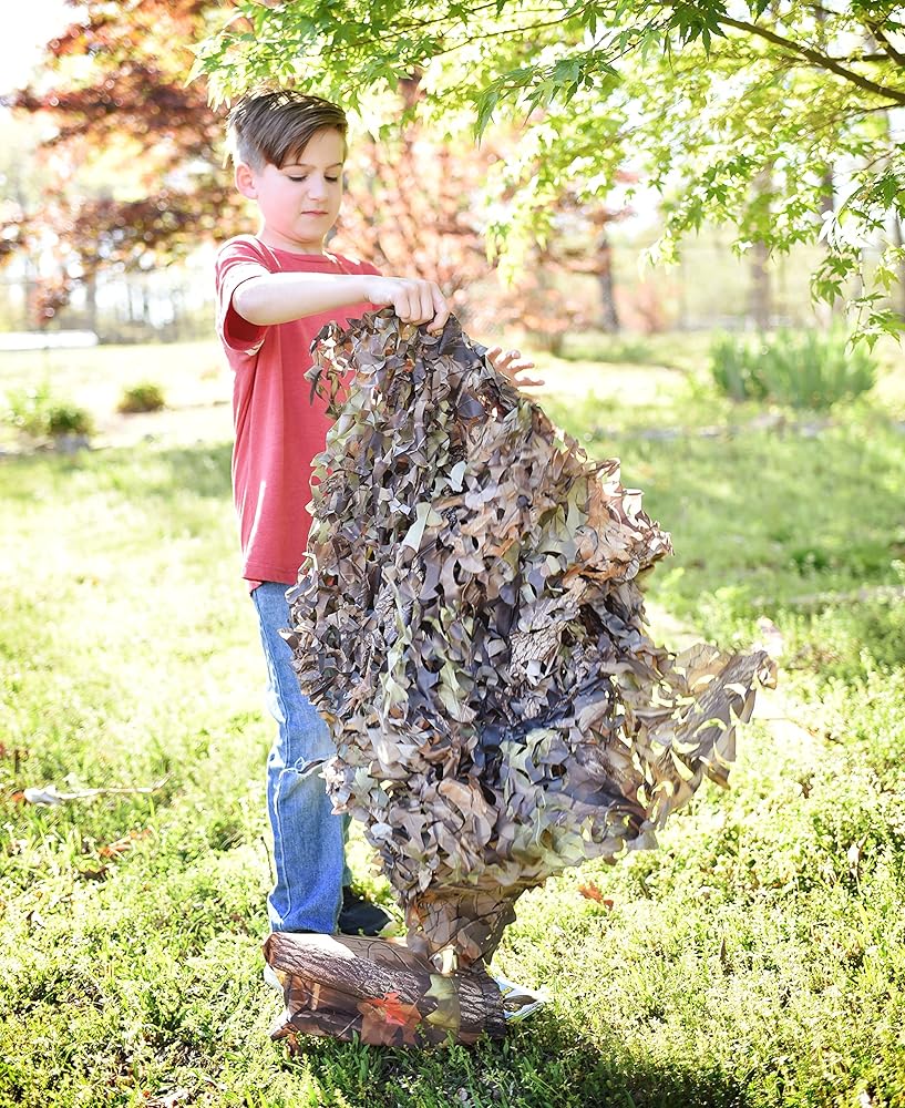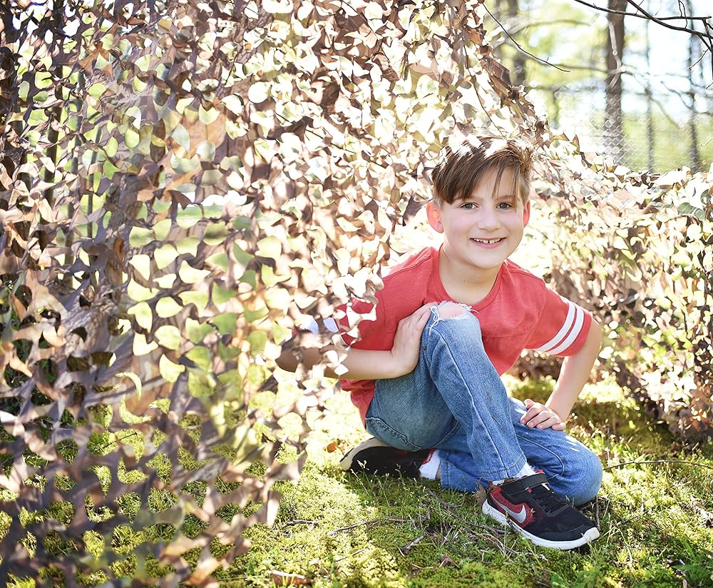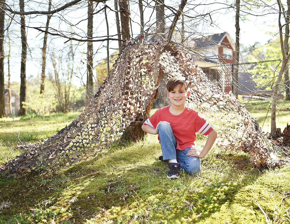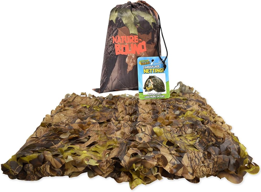 Nature Bound camo material is perfect for building a kids fort. Durable spun-bounded polyester with leaf pattern makes for a real-life playing experience. Can be used to build a tree fort, blind, indoor fort, or play camping. 60" x 108", includes drawstring stuff sack, recommended ages 5+.