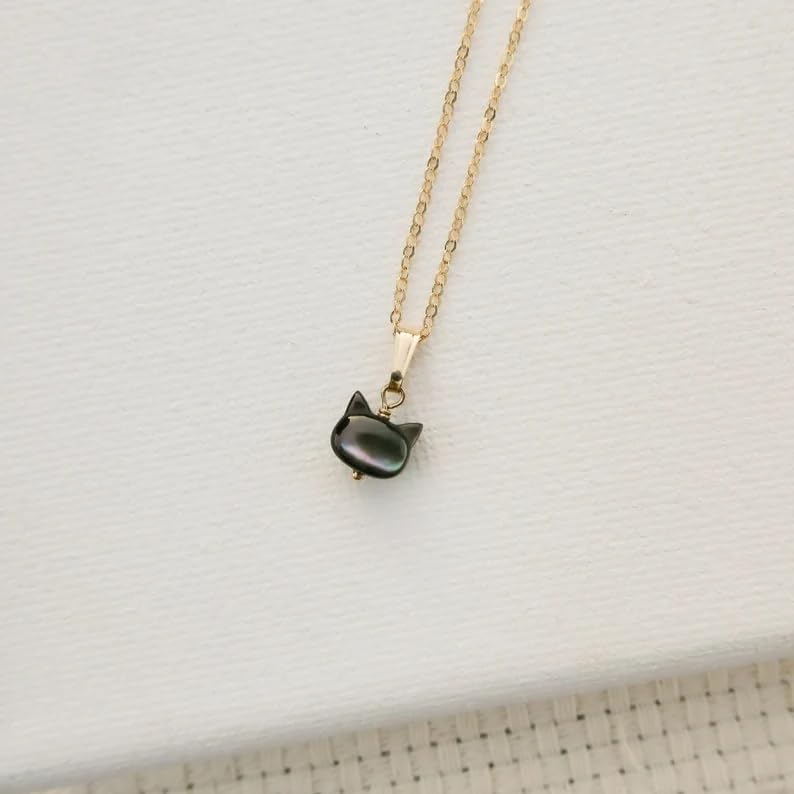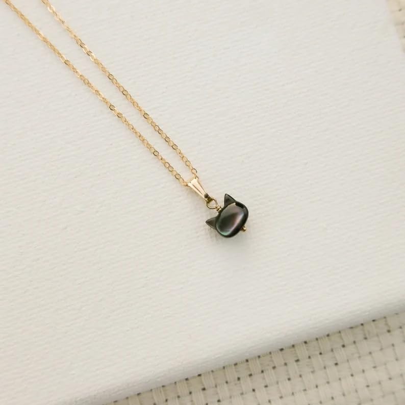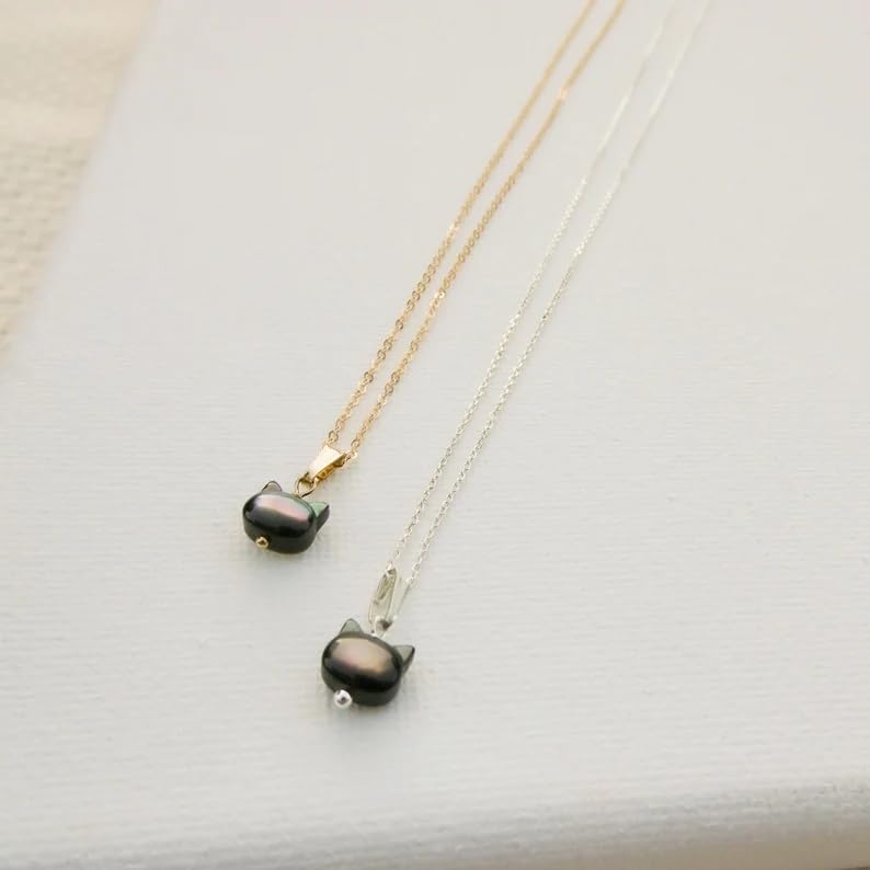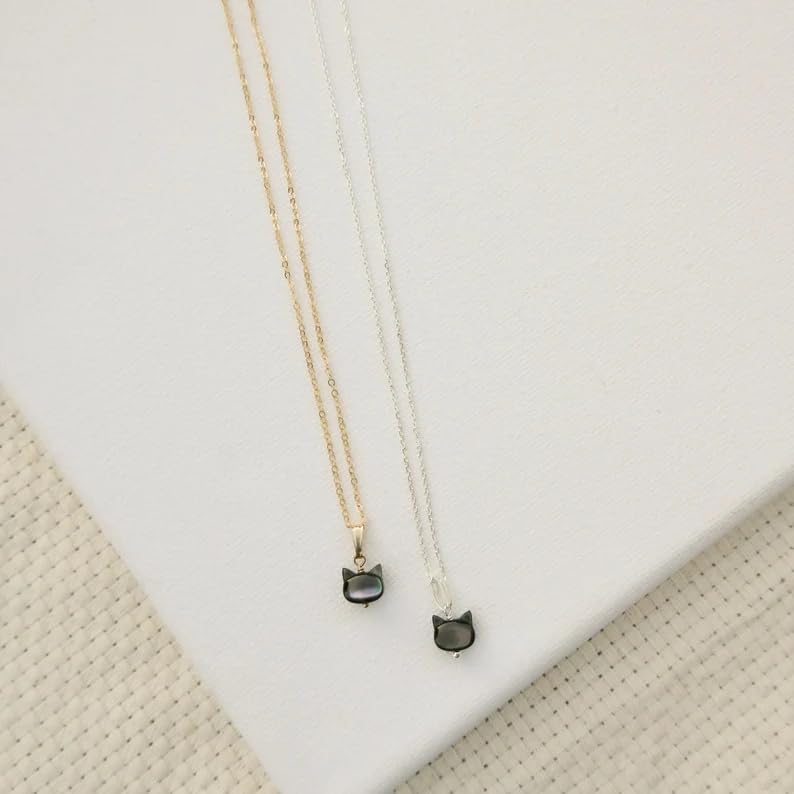 These Black Cat handcrafted necklaces feature the daintiest black cat charm made out of the most beautiful black Mother of Pearl. Each individual gemstone has been carved by hand and contains unique flashes of blue, green, purple, and silver. They are the perfect piece to keep your pet close at all times even when they have to be left behind at home.