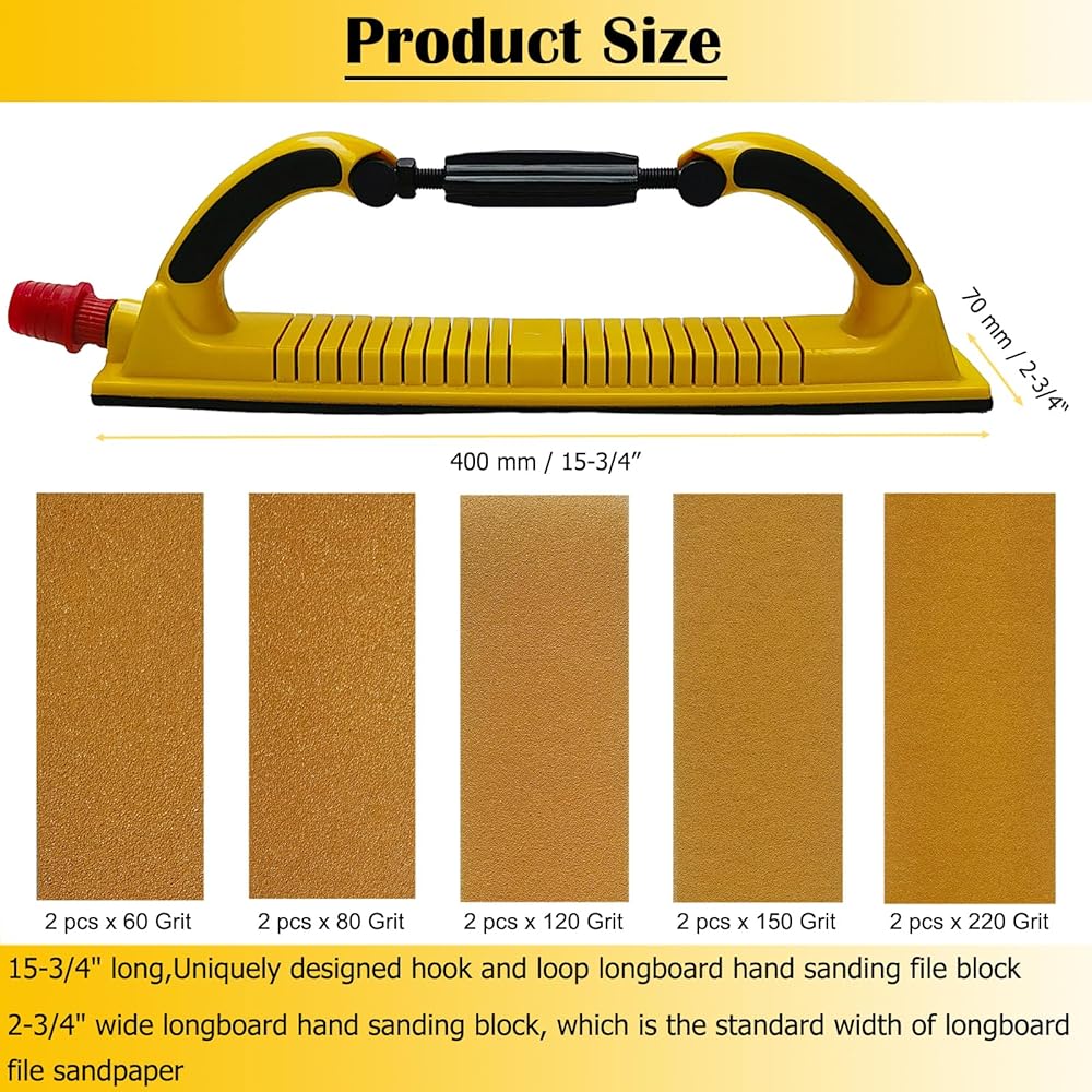 • Adjustable Longboard Hand Sanding File Block,15-3/4" long,2-3/4" wide,Uniquely designed hook and loop longboard hand sanding file block,it can be used with hook and loop long board sandpaper or rolls