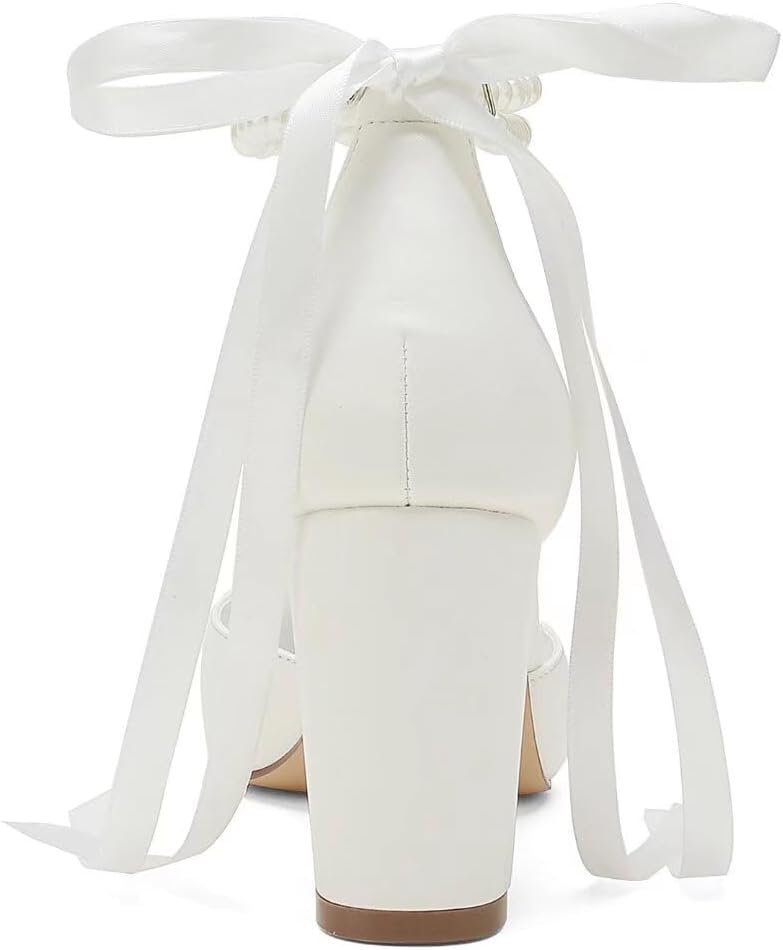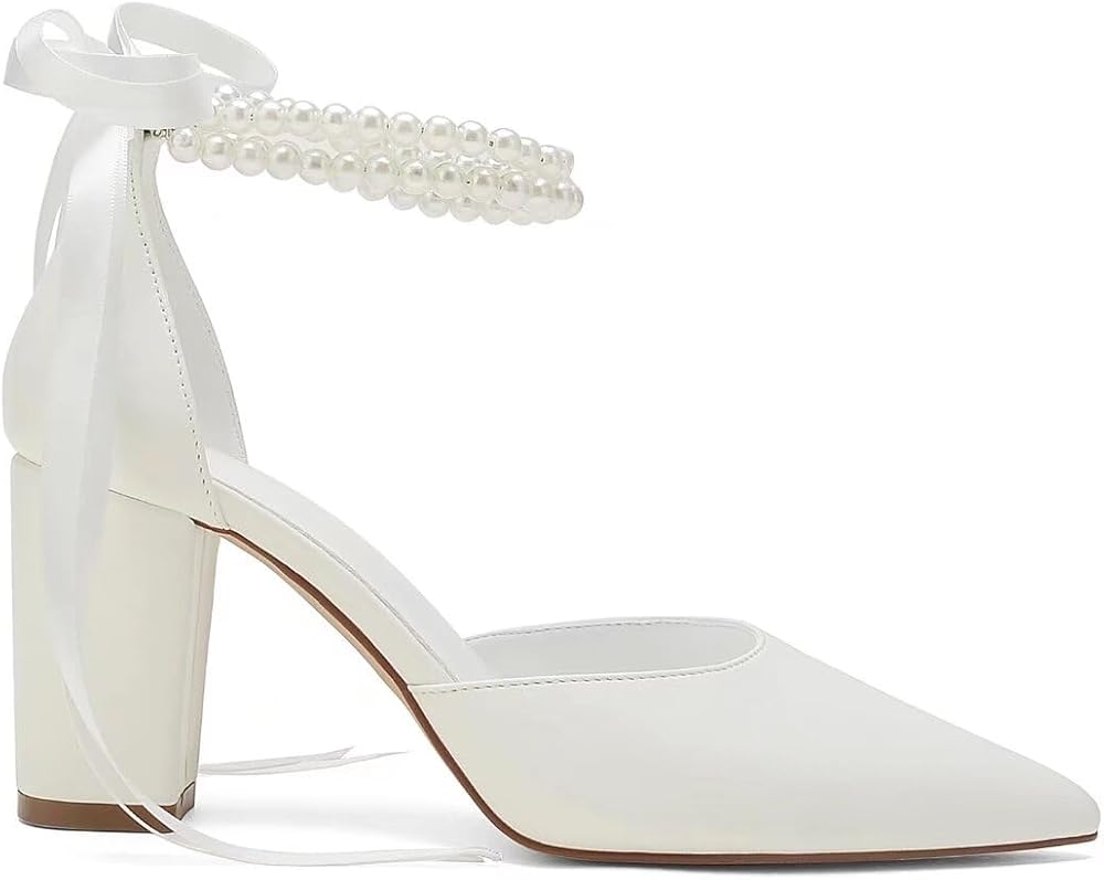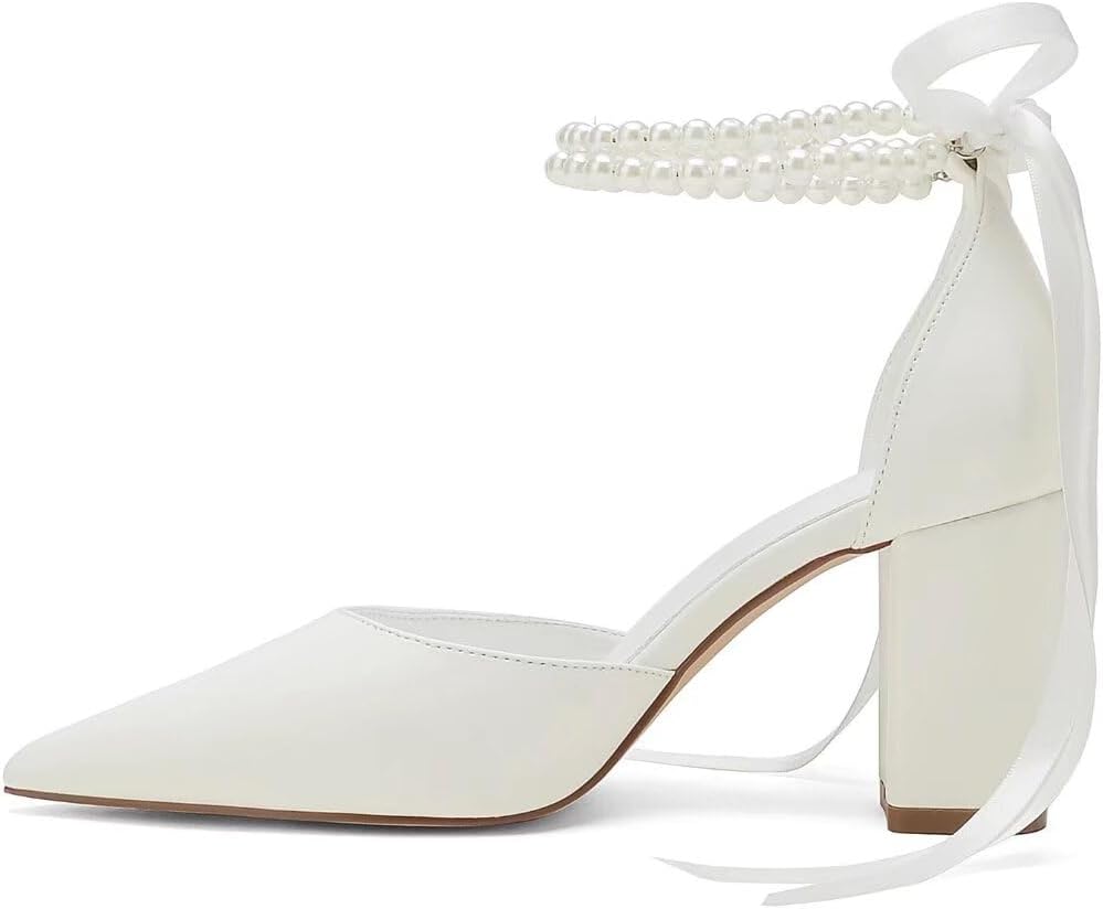 Pearl Wedding Shoes for Bride Block Heel Pointed Toe Bridal Shoes Wedding Heels Chunky