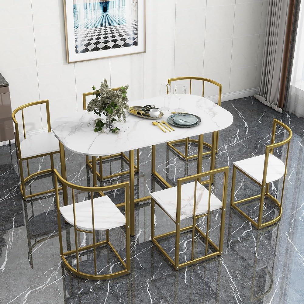 [Compact Dining Table Set] This dining set offers both functionality and space-saving design, featuring a 55-inch table with six comfortable chairs that can be conveniently tucked under the table when not in use. Ideal for small living spaces, this set provides a luxurious dining experience without taking up too much room.