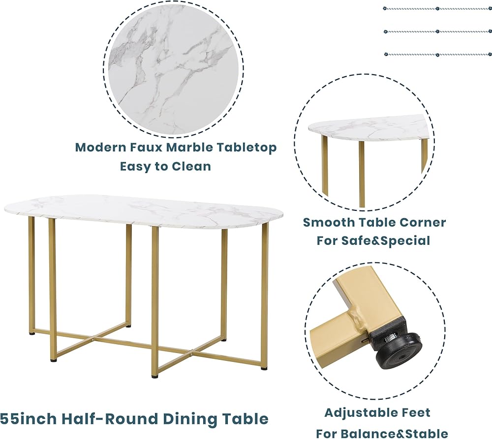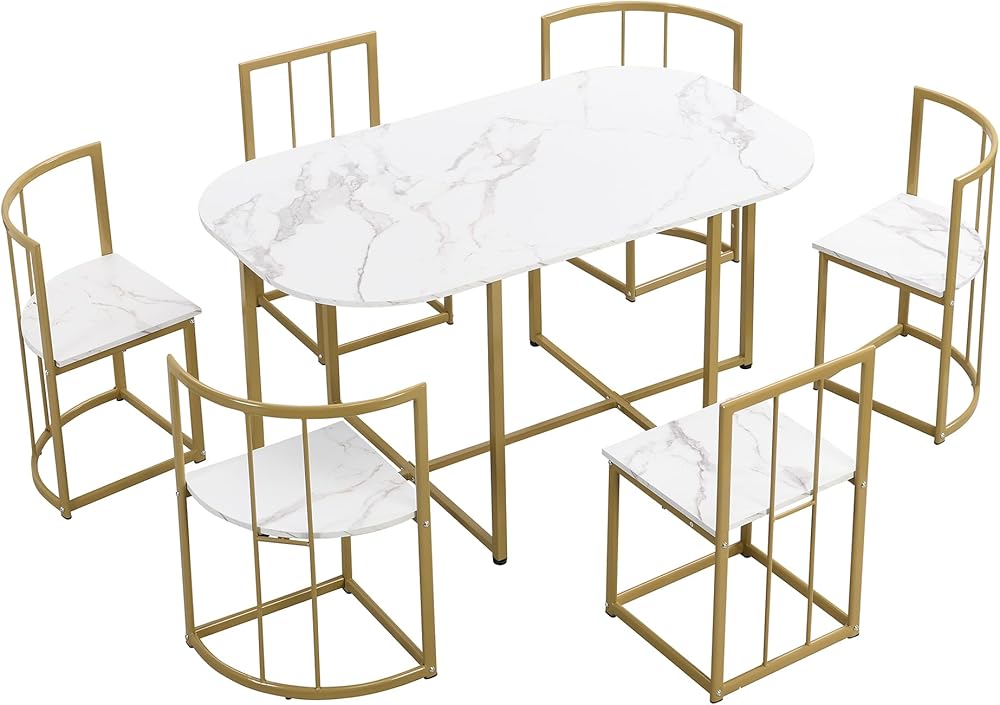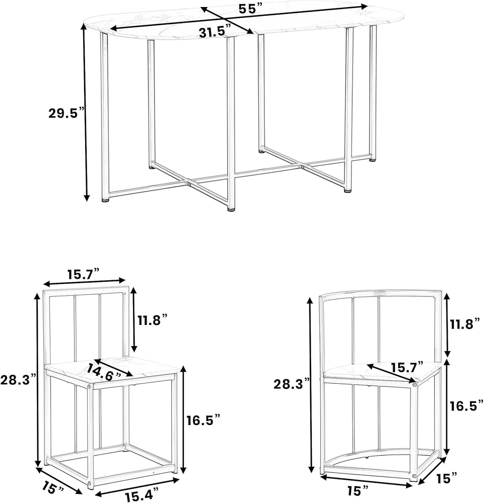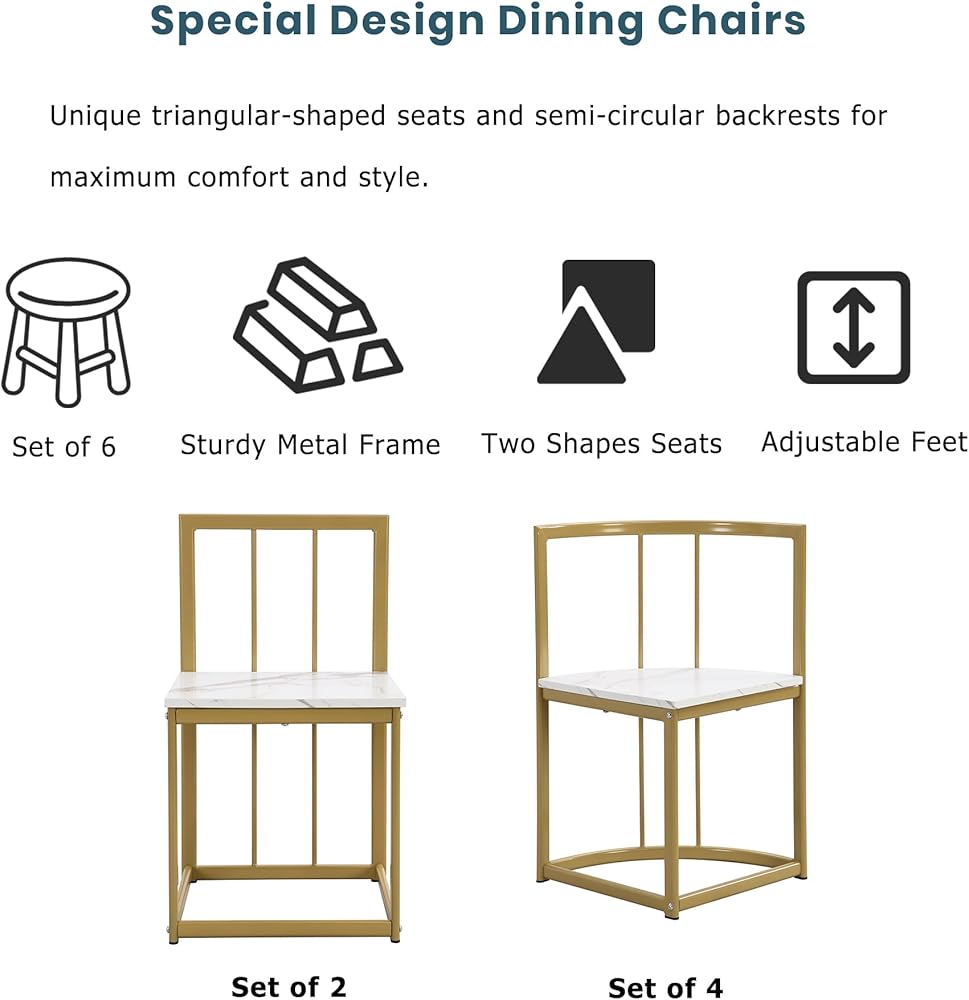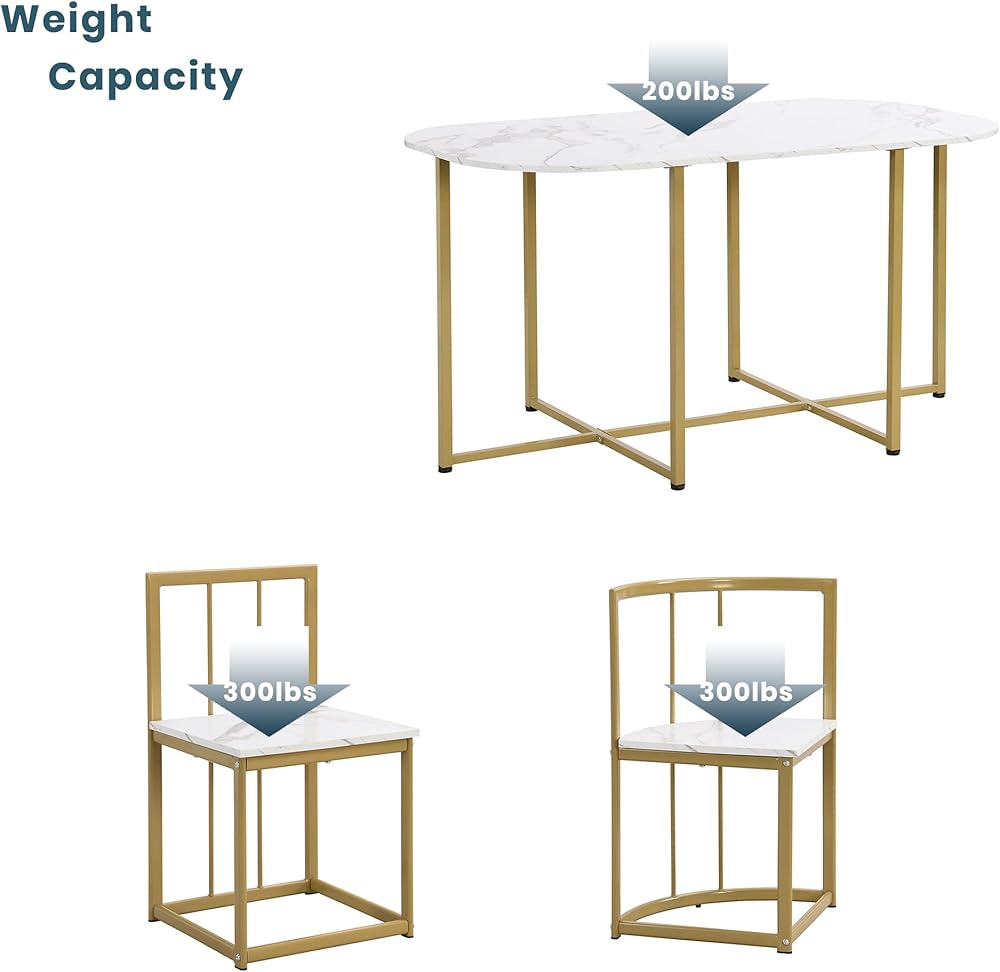 Weight & Dimensions & Specifications Overall Product Dimension Table: 55x31.5x29.5 inches (LxWxH); Table thickness: 0.6 inches; Middle Chair: 15x15.4x28.3 inches (LxWxH); Triangular Chair: 15x15x28.3 inches (LxWxH); Seat to ground: 16.5 inches Overall Weight Table Net Weight: 34.6lbs; Middle Chair Net Weight: 9.3lbs; Triangular Chair Net Weight: 8.2lbs Weight Capacity Table Weight Capacity: 200lbs; Chair Weight Capacity: 330lbs Material Table/Chair: MDF top; Iron Frame Pieces Included 6 Chairs + 1 table Color Golden + Faux Marble White Assembly Required Yes Additional Tools Required All Tools Included Country of Origin China Product Warranty Please Read Return Policy Maintenance & Notice We recommend dusting frequently with a clean, soft, dry, lint-free cloth. Clean the surface by rubbing in the direction of the grain and wipe dry.