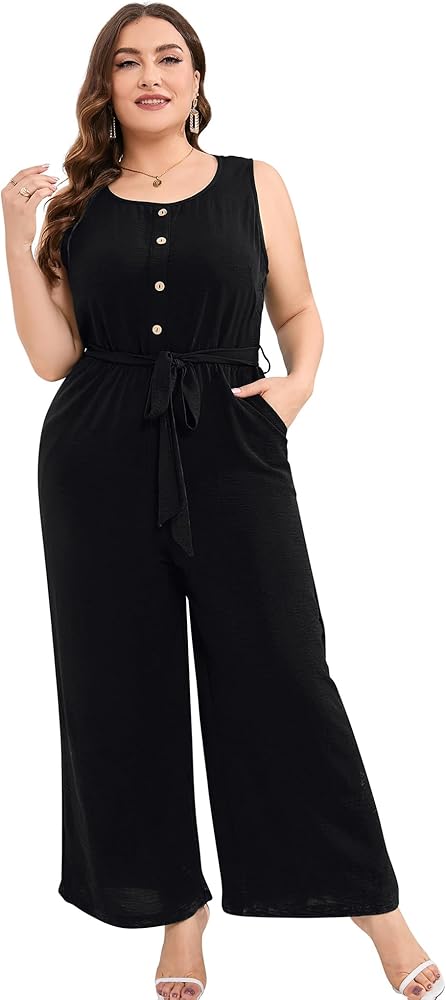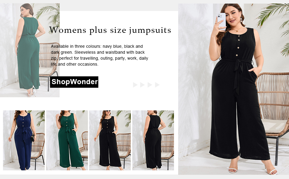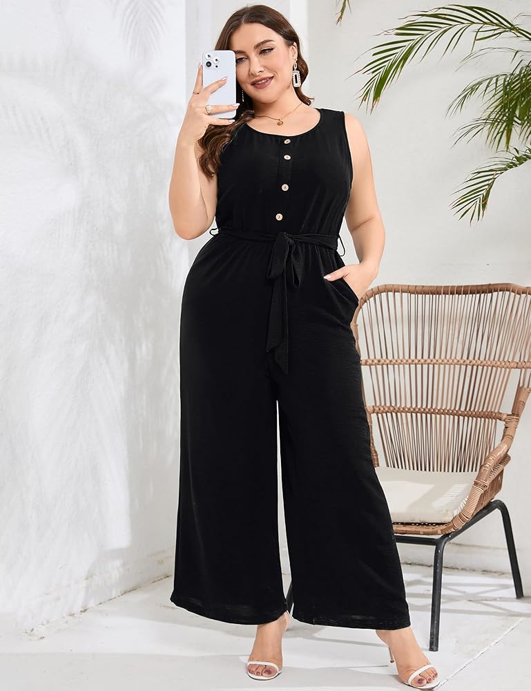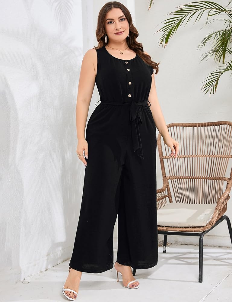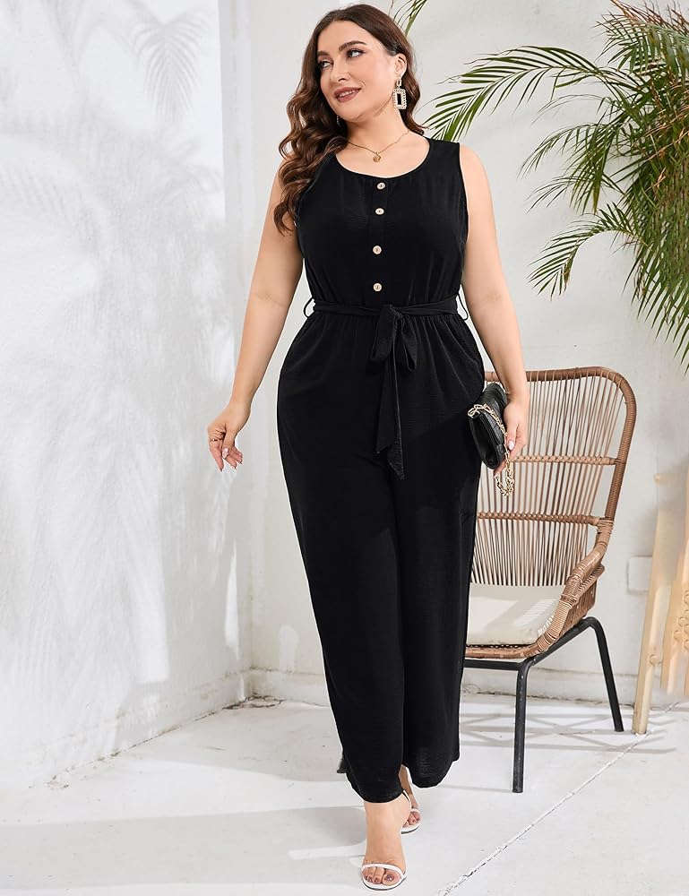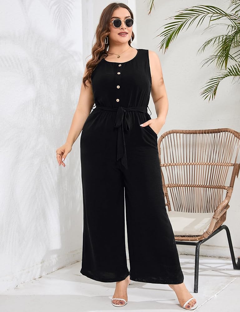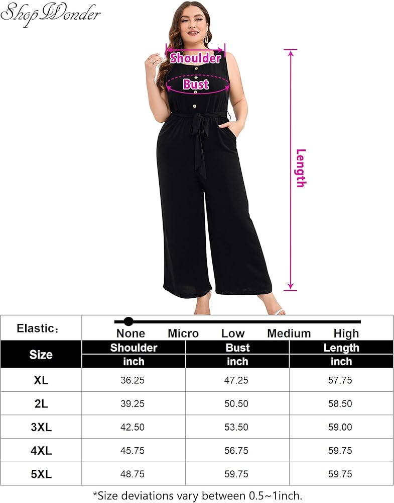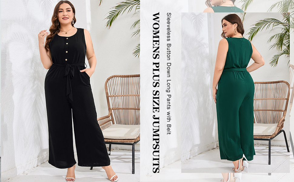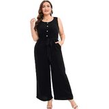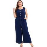 المزايا: خصر عالي مرن، بدون أكمام، أزرار سفلية، مقاس فضفاض، لون ثابت، بنطلون واسع الساق مع جيبين جانبيين.