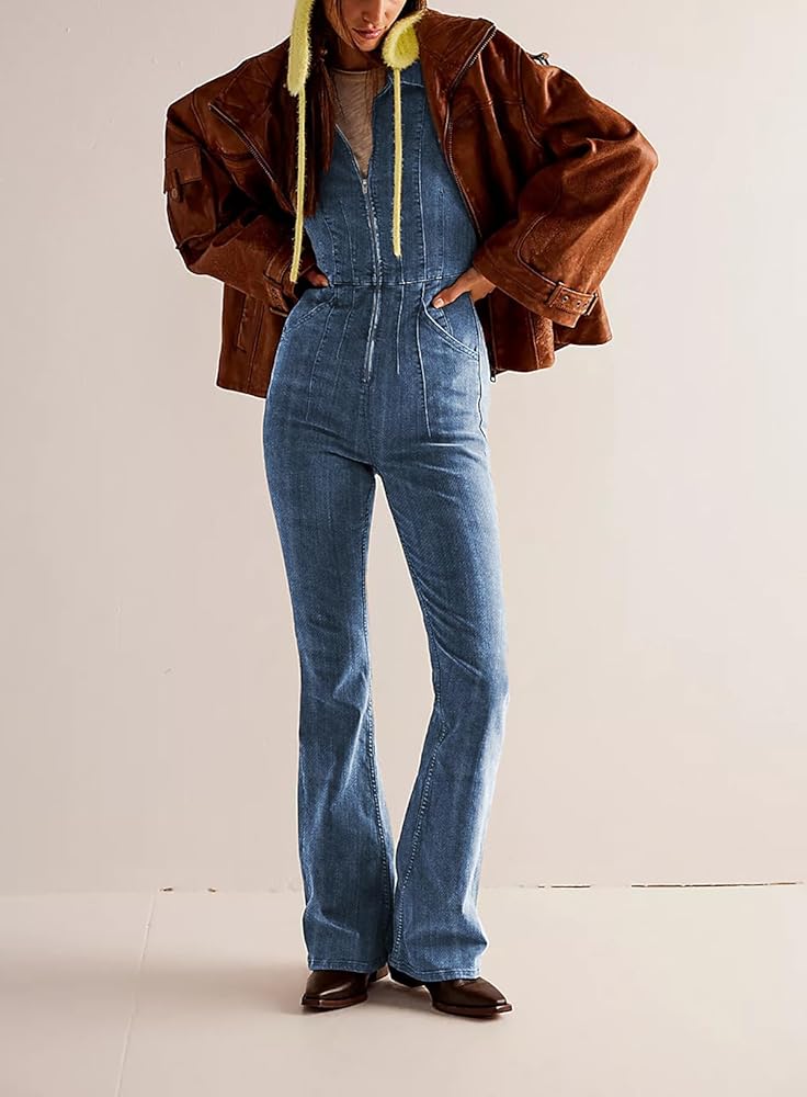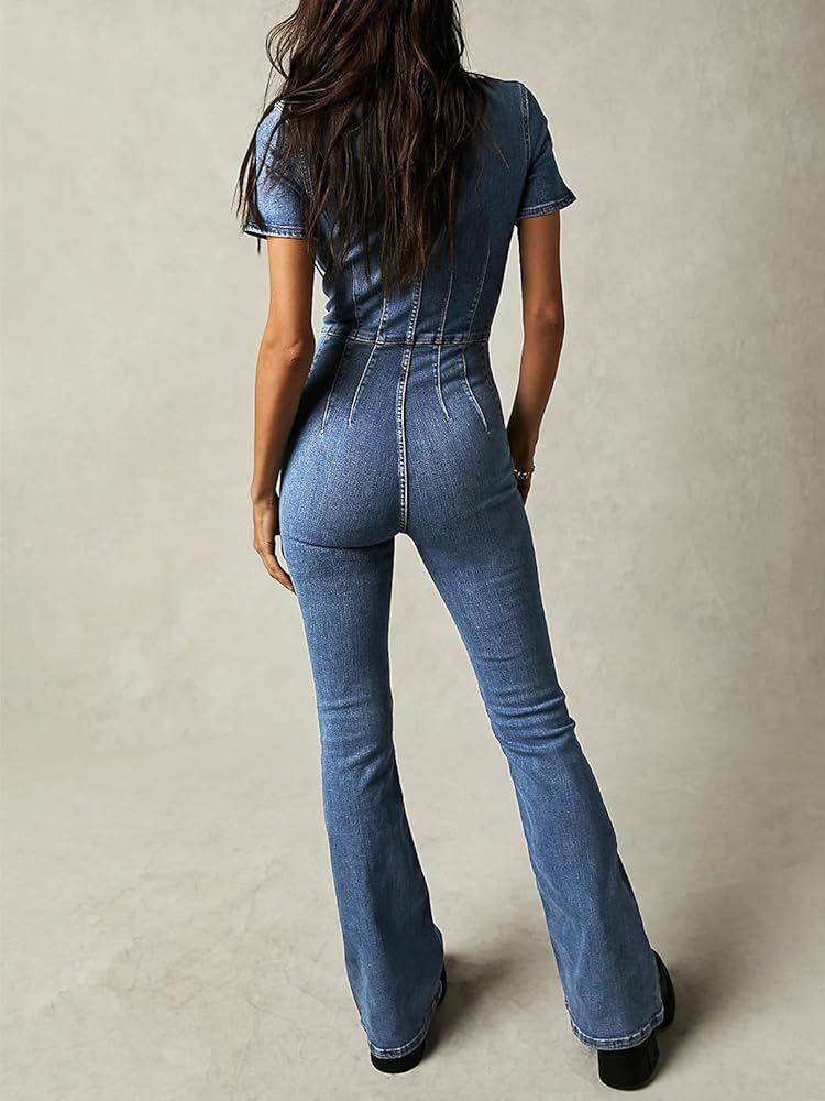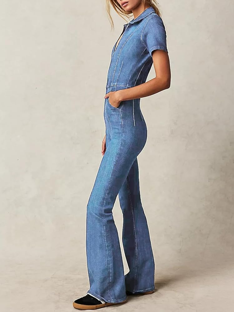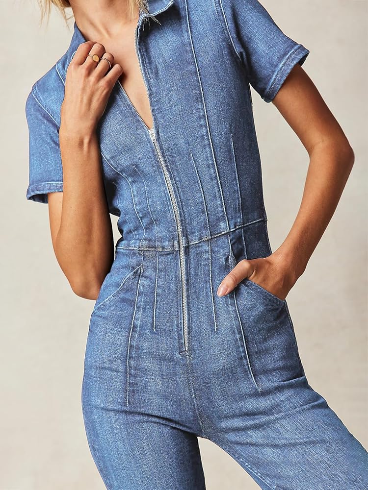 بدلة PLNOTME النسائية المضيئة من قماش الدنيم اللطيفة بأكمام قصيرة وسحاب جينز طويل مع جيوب