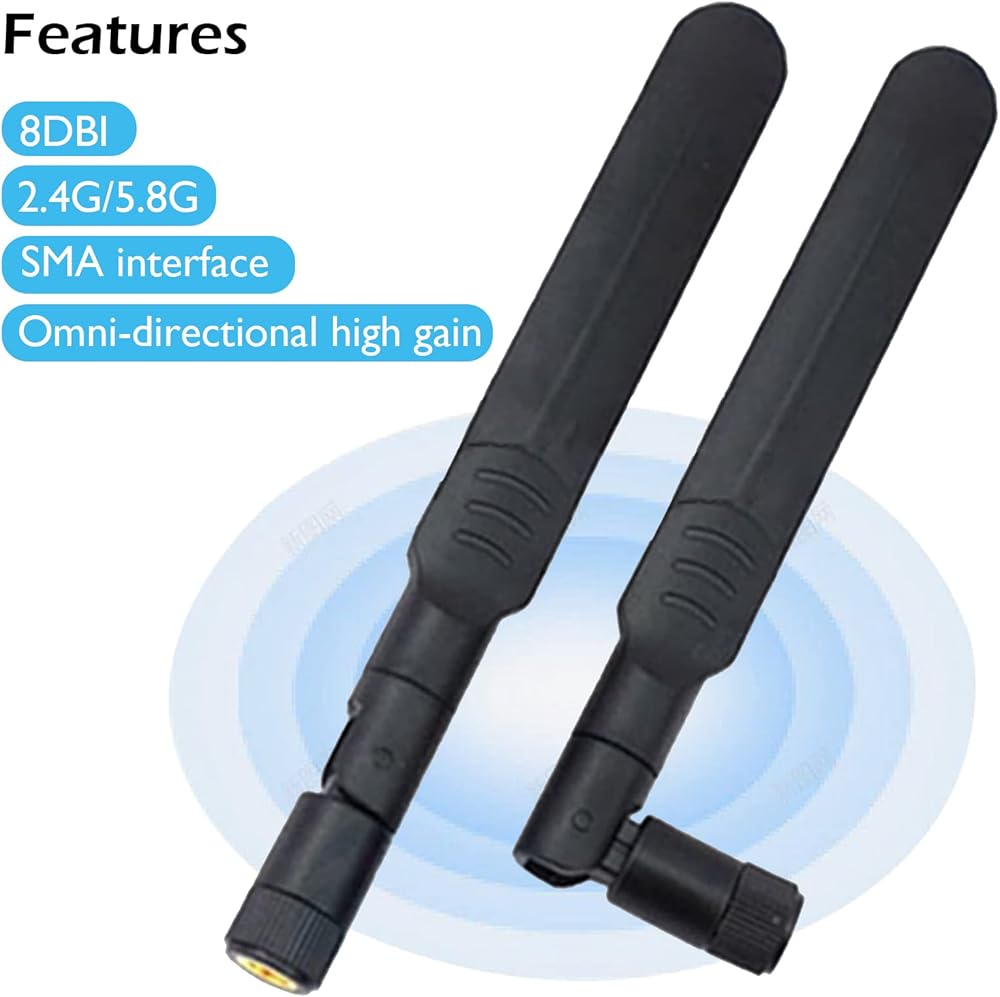 The antenna features an RP-SMA male connector, which is a common connector used in many WiFi routers, access points, and wireless adapters. The 8DBi Dual band 2.4G/5.8G WIFI; the 2.4 GHz band provides better coverage and range, while the 5.8 GHz band provides higher data transfer rates. Improve the range and performance of wireless devices.